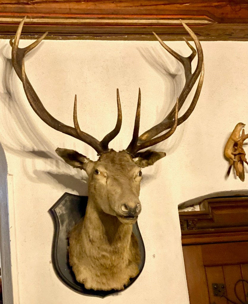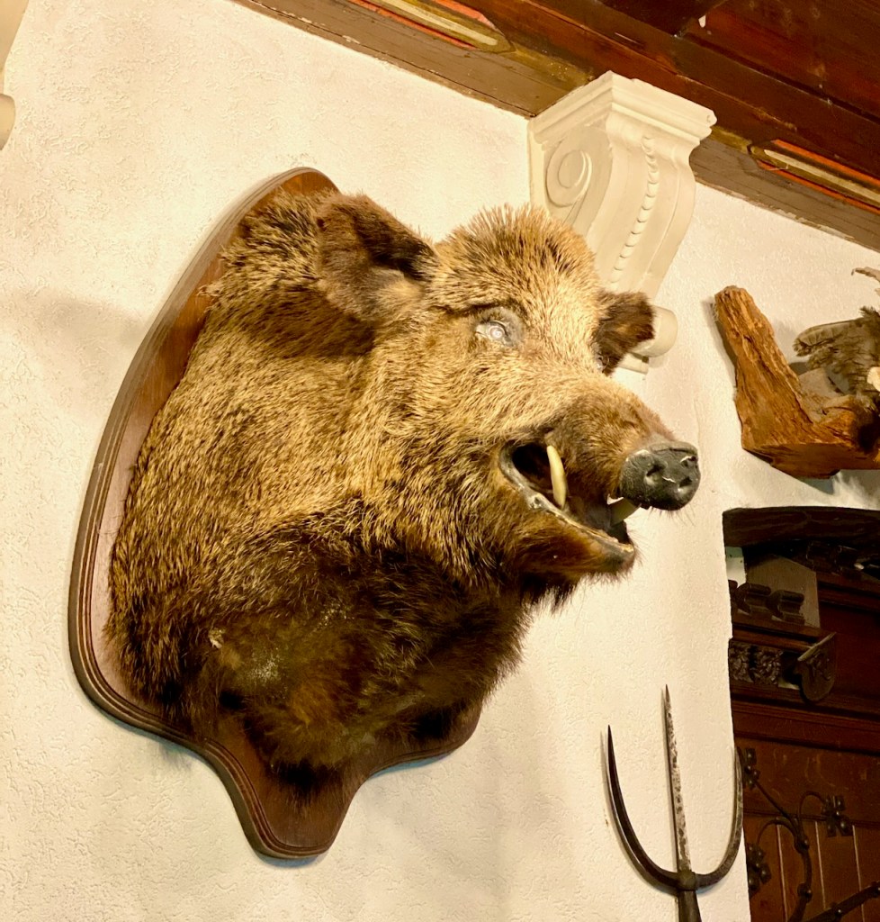 Metsästäjän huoneessa on sekä metsästäjien aseita että saaliiden päitä. Tämä villisika on ollut valtava, se on painanut elävänä 181 kiloa.