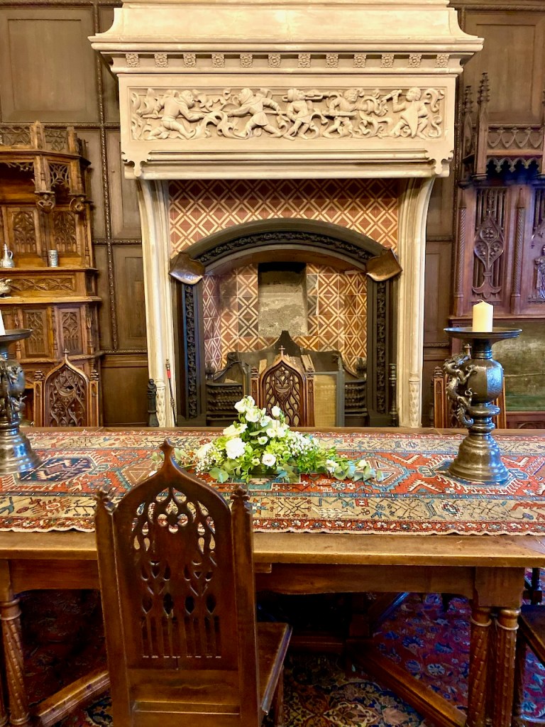 Ruokasalissa on ylellisiä tammiveistoksia ja huonekaluja sekä iso takka. Nämä kuvaavat linnan uudelleen 1600-luvun lopulla rakentaneen Ravenén makua. Ensimmäisessä kuvassa näkyy myös takkaa vastapäätä olevalla seinällä upea sinikuvioinen Delft-astiasto kaapissa.