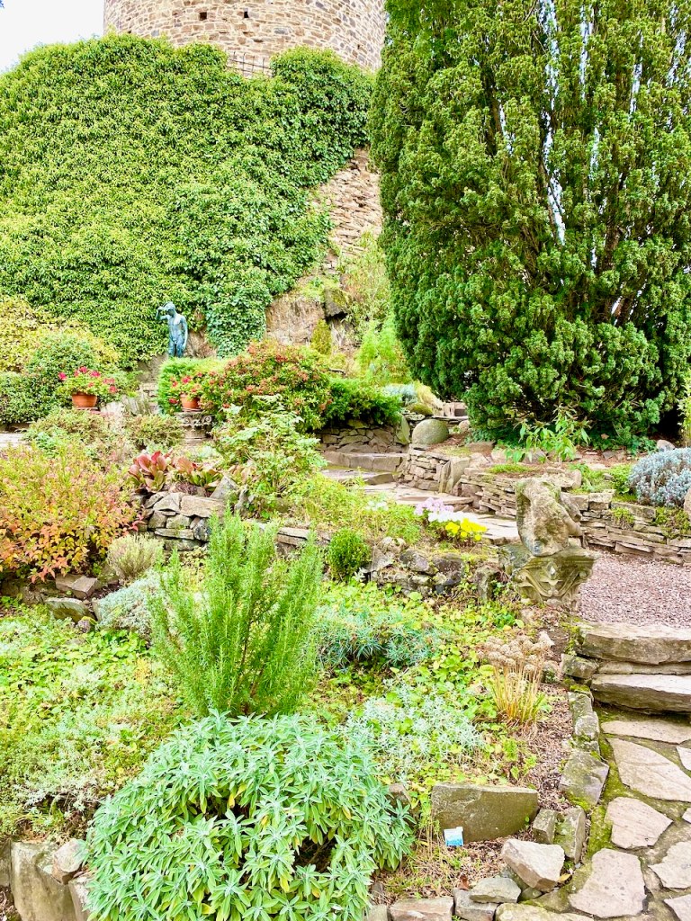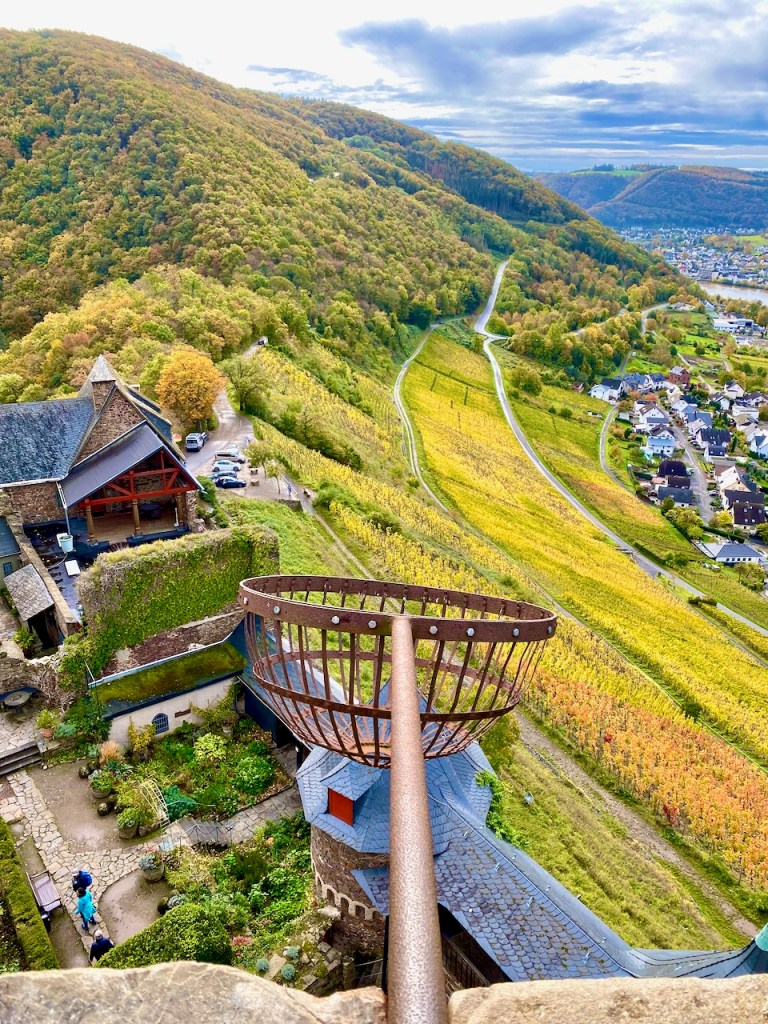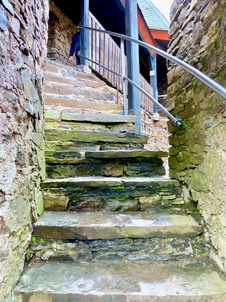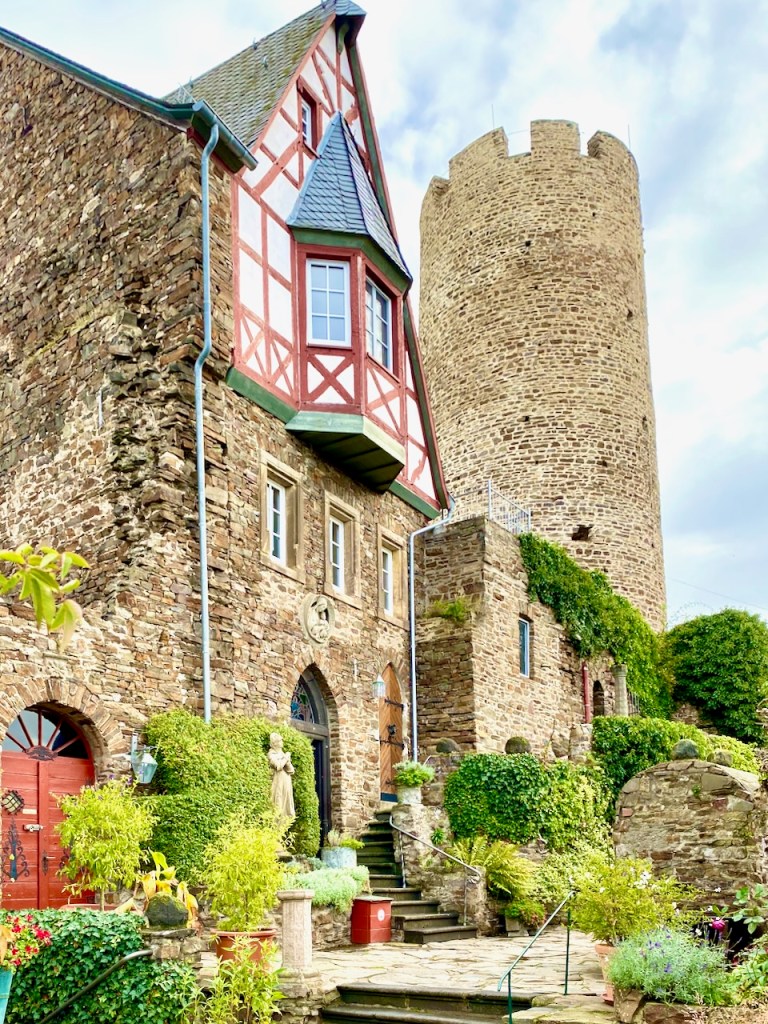 Tämä korkealla Moselin yläpuolella Alkenin kylän rinteellä sijaitseva linna on siitä kiva, että voit tutustua siihen niin kuin itse haluat. Raunioilta on upeat näkymät, piha on kohokohta kukkien ystäville. Vierailu on ilman muuta kohtuullisen sisäänpääsymaksun arvoinen. Kassalla on myös matkamuistoja sekä kahvin lisäksi muuta syötävää. Istumapaikkoja maisemien rentoon ihailemiseen on eri pitkin pihaa. Eikä sinne torniin ole mikään pakko kiivetä. Minua siihen kehottanut mies istui pihalla tullessani alas ja kysyi: ”Oliko hyvä, kannattiko käydä?” Sanoin, että totta kai, kiitos neuvosta. Samaa kysyi Juha ja totesin hänellekin, että totta kai oli kivaa.