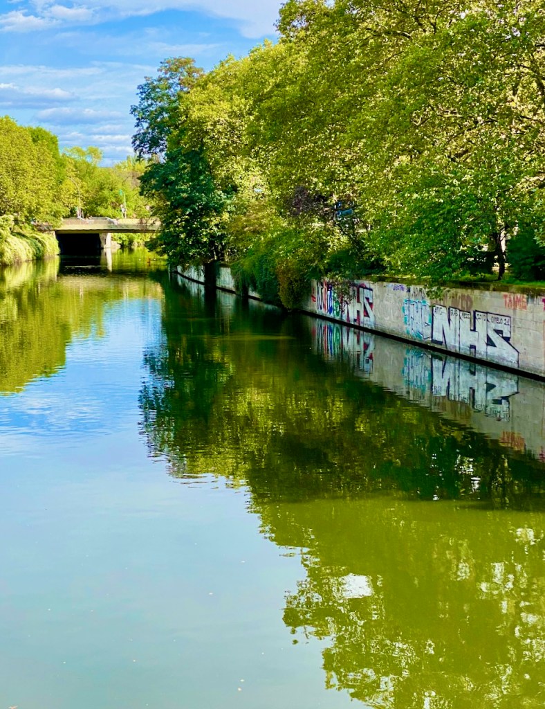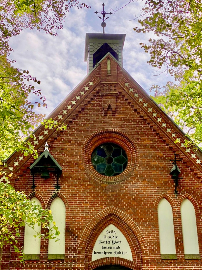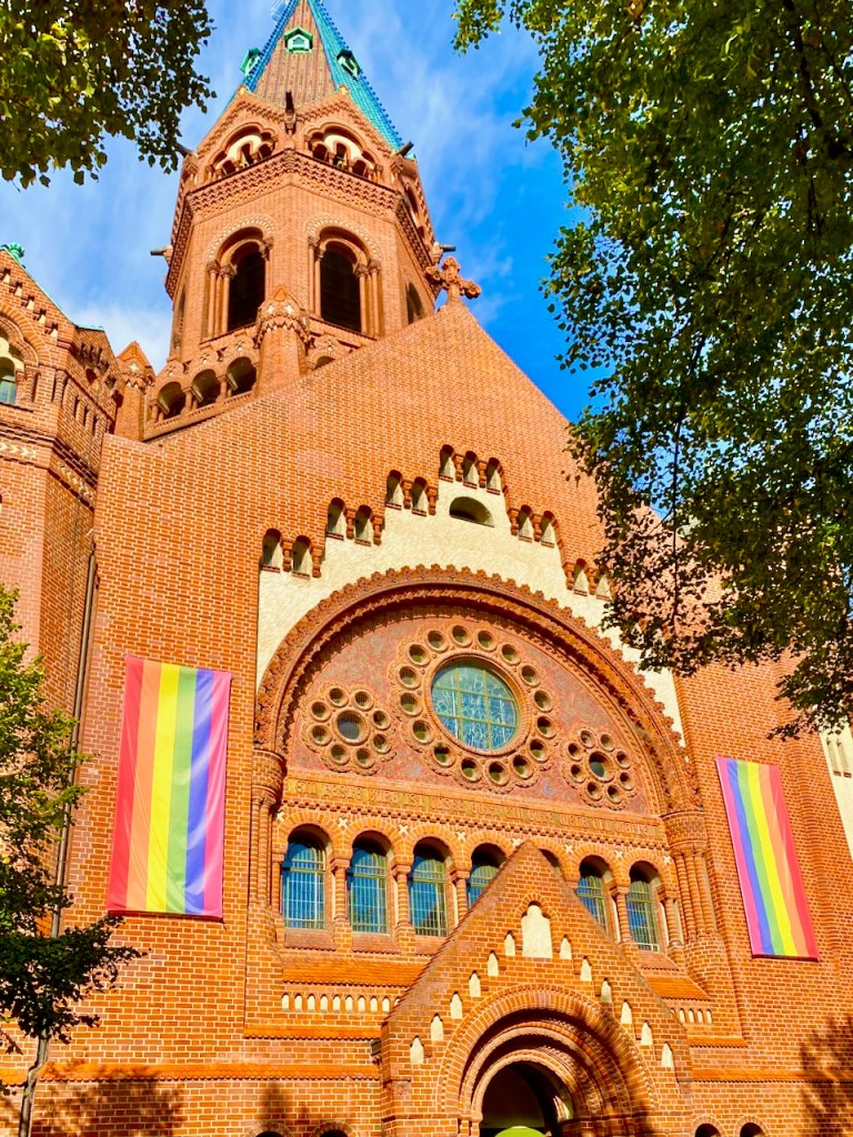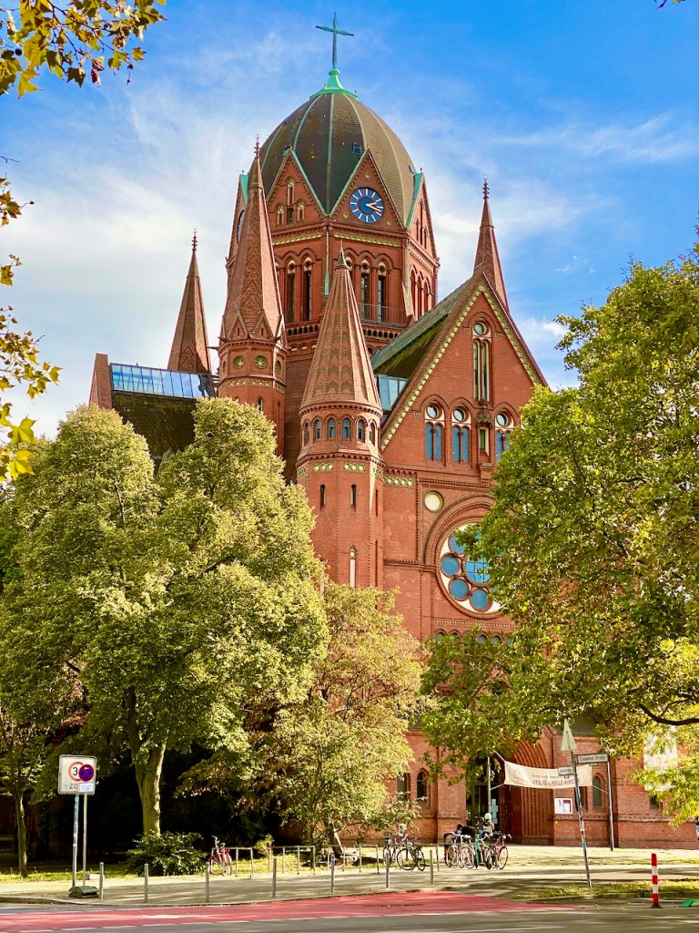 Tiesimme jostain, että Berliinissä on suomalainen seurakunta ja netistä löytyi tieto, että he järjestävät Suomi-keskuksen vieressä olevassa Passionskirchessä kerran kuussa jumalanpalveluksen ja se sattui juuri tälle sunnuntaille. Hotellistamme oli kahden ja puolen kilometrin aurinkoinen kävelymatka tänne ja matkan varrellakin oli nähtävää. Esimerkiksi toinen komea kirkko, puistoja ja jokirantaa.