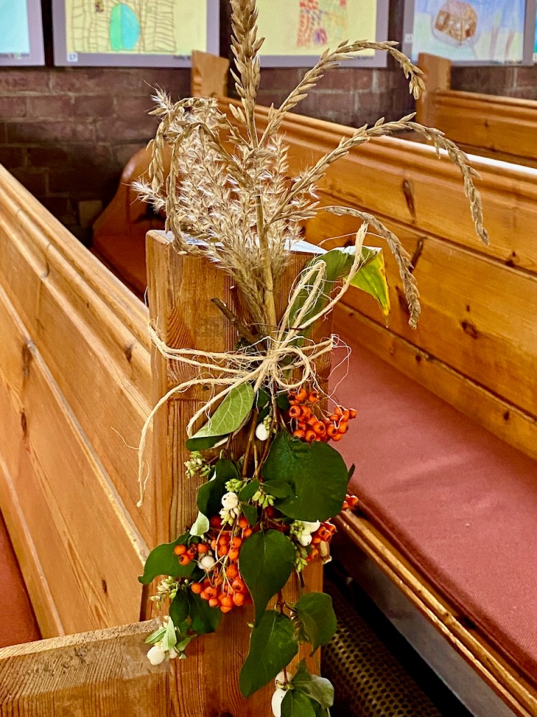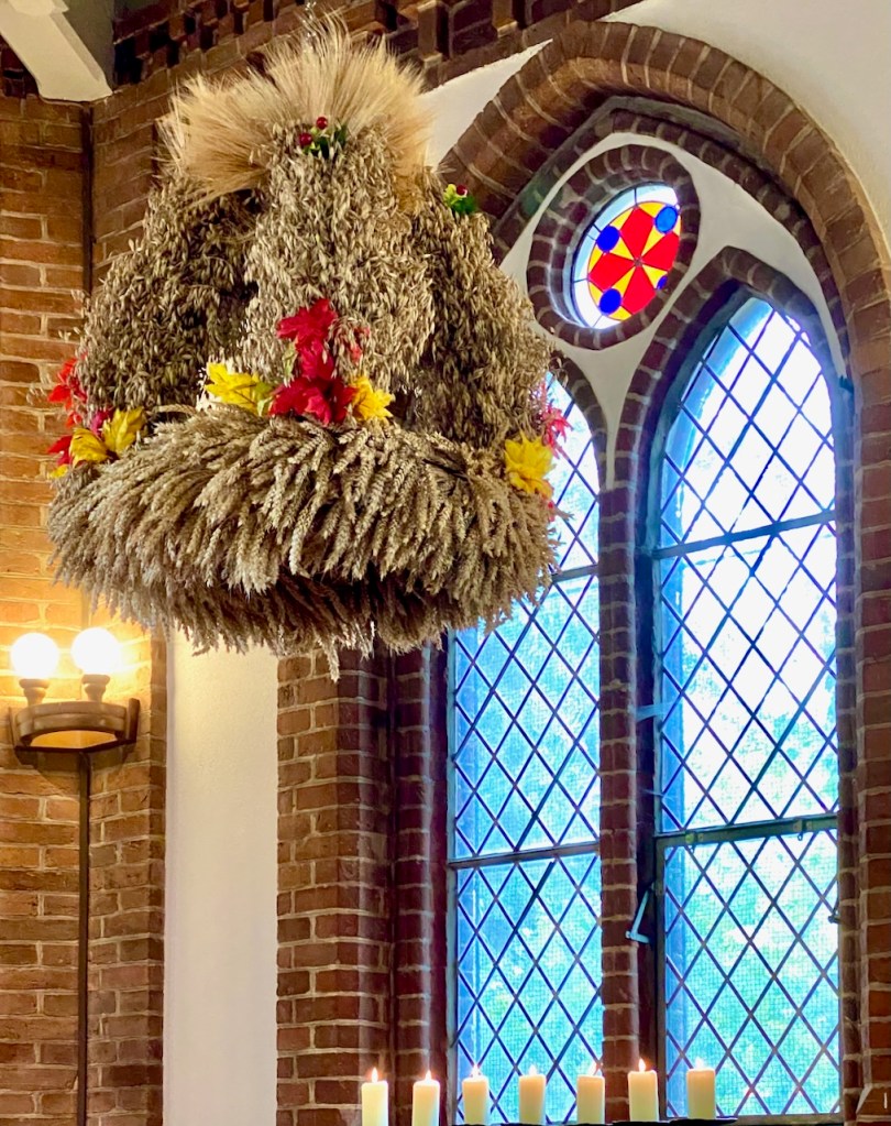 Tämä sunnuntai oli sadonkorjuun kiitossunnuntai. Alttarille oli tuotu syksyn satoa kiitokseksi siitä.