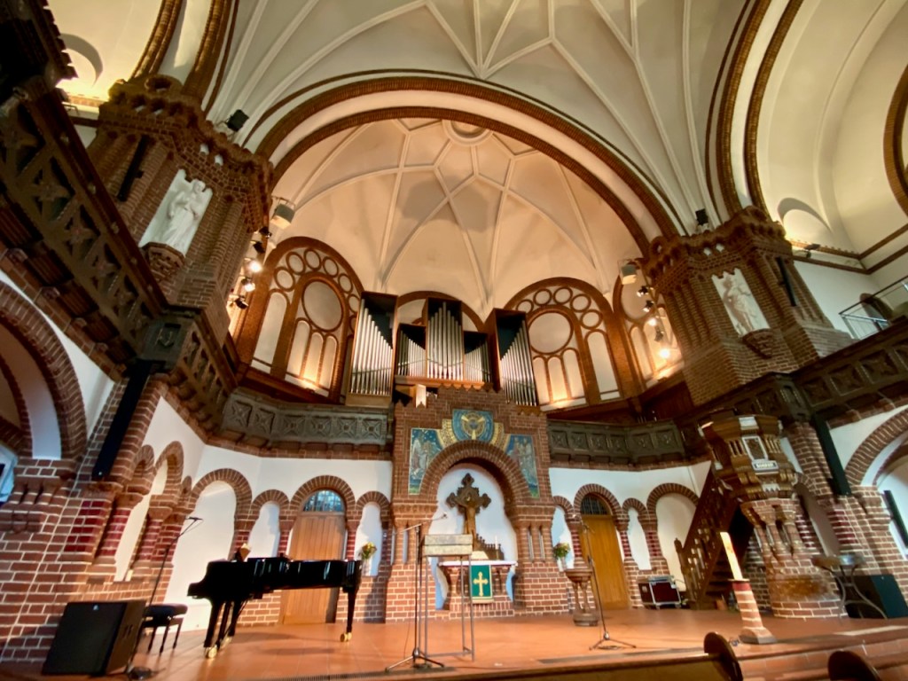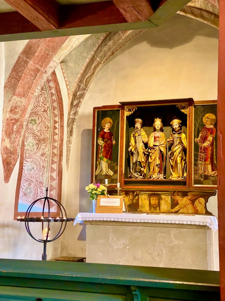 Kun tulimme sisään, meidät toivotettiin tervetulleiksi ja kysyttiin: ”Sind Sie neu hier?” Ja kun myönsimme olevamme uusia ja turisteja, meille kerrottiin heti myös, mistä laulut löytyvät. Löytyivät hyvin ja nuottejakin oli, että selvittiin. Kaunis pieni kirkko