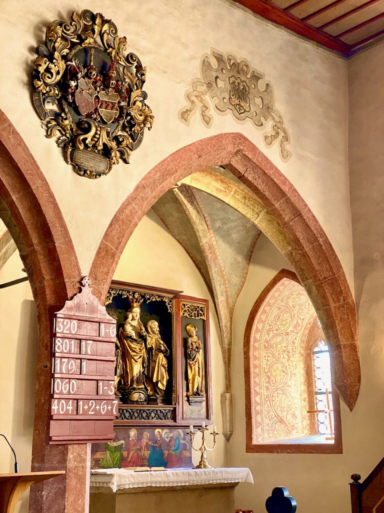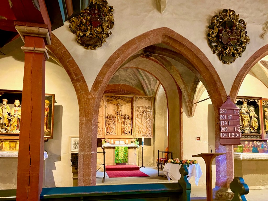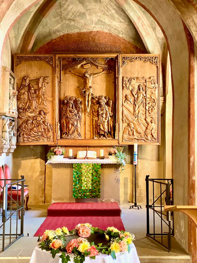 Seuraavana viikonloppuna olimme Rothenburg ob der Tauberissa ja sunnuntaina lähdössä sieltä eteenpäin. Majapaikkamme oli Betwarissa kymmenkunta kilometriä Rothenburgista pohjoiseen ja se Evangelische Gottesdienst löytyi tältä väliltä Detwangista pienestä kirkosta. Pieni haaste oli se, että se alkoi jo yhdeksältä ja meidän piti siis nauttia aamiainen ja pakata auto aikaisin sunnuntaiaamuna. Mutta hyvin ehdittiin.