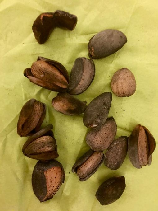 Manteli on muuten hedelmä, ihan syötävää sellainen. Eli ennen kuin kuori on kuivunut ruskeaksi, se on syömäkelpoinen, näin vihreänä. Silloin hedelmäkiven sisällä mantelin sisus on vielä pehmeä ja täynnä maitomaista litkua.