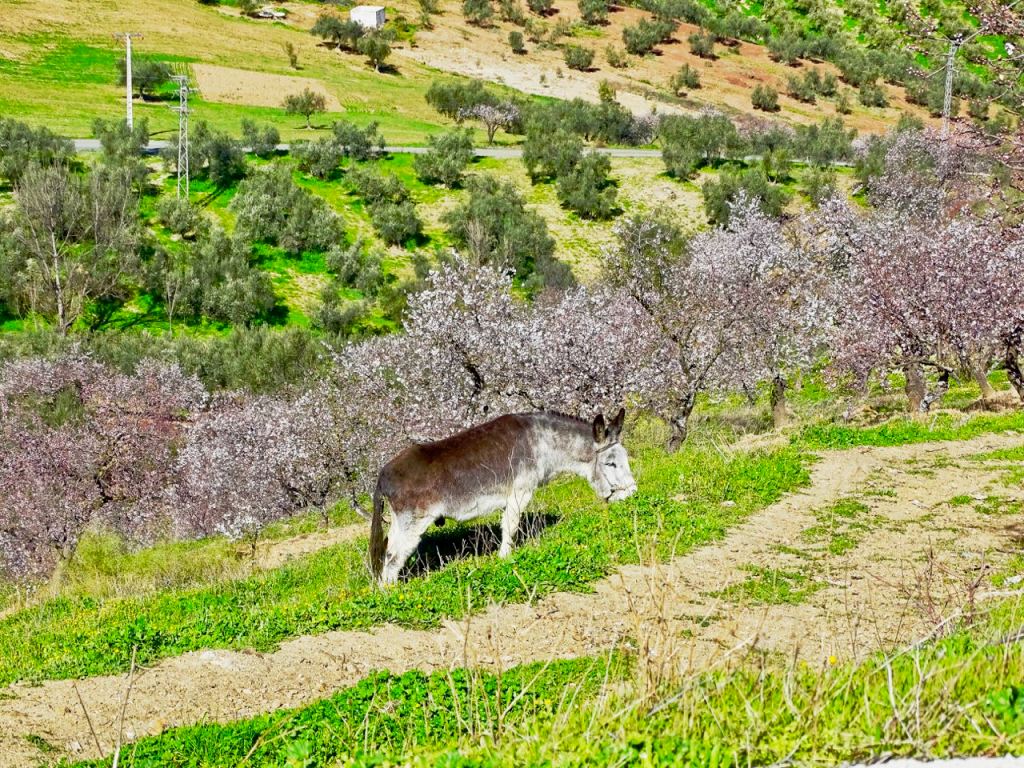 Kylmä tuuli vihlaisi sen verran, että ennen kuin jatkoimme pitemmälle rinteeseen, otin repusta toisen takin ja lisäsin leggingsit farkkujen alle. Kuvitelma tästä operaatiosta kertoo samalla erittäin selvästi, miten vähän muita ihmisiä rinteessä oli. Yksi paikallinen aasintaluttajaukko kävi kertomassa, että voisimme poimia vähän manteleita ja maistaa, ja toinen manteleita ämpäriinsä poiminut mies huikkasi buenakset ja kysyi, olemmeko brittejä. Eikä ymmärtänyt sanaa Finlandia millään.