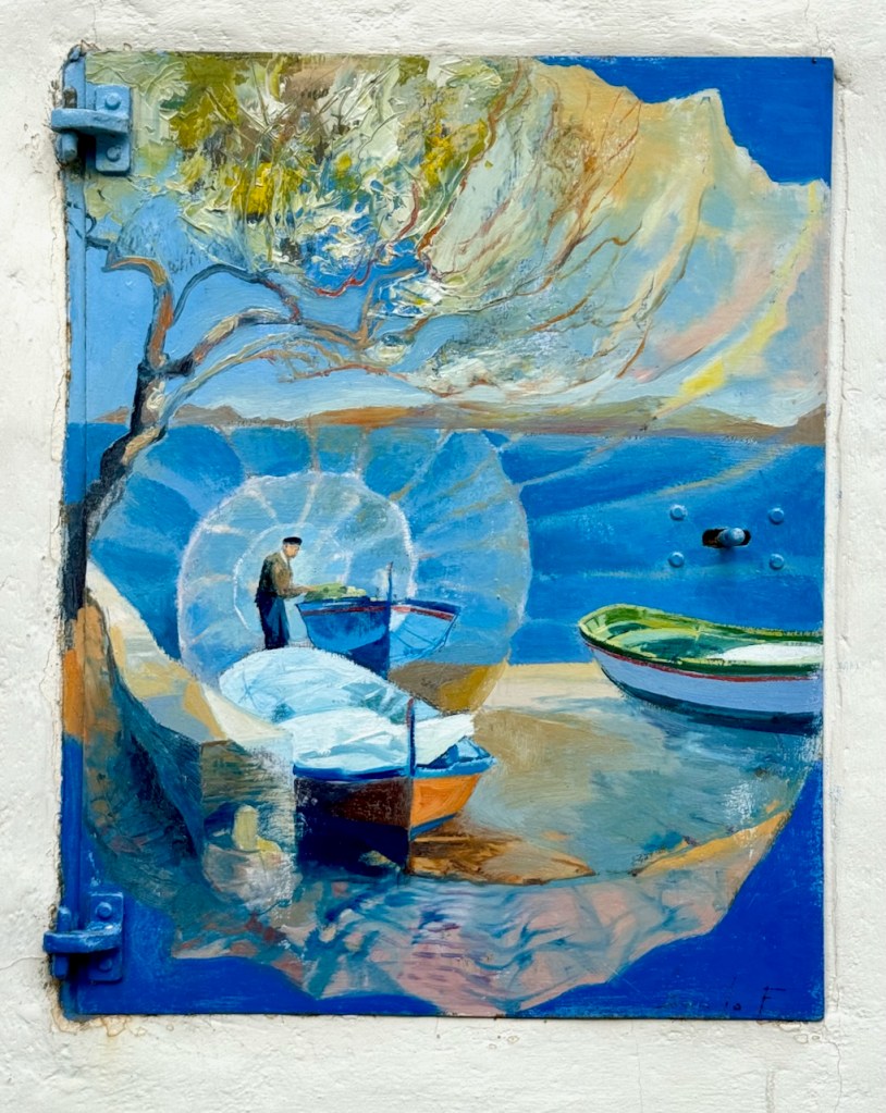 Yhdessä talon seinän luukussa oli värikäs maalaus.
