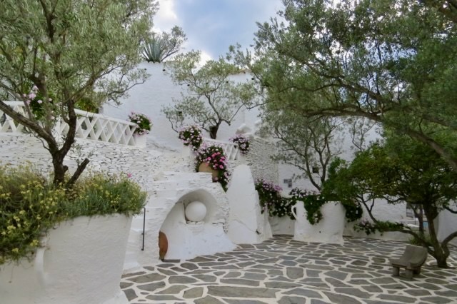 Piha oli ihana. Valkoiset muurit ja valkoisia ja vaaleanpunaisia ja vaalean keltaisia kukkia.