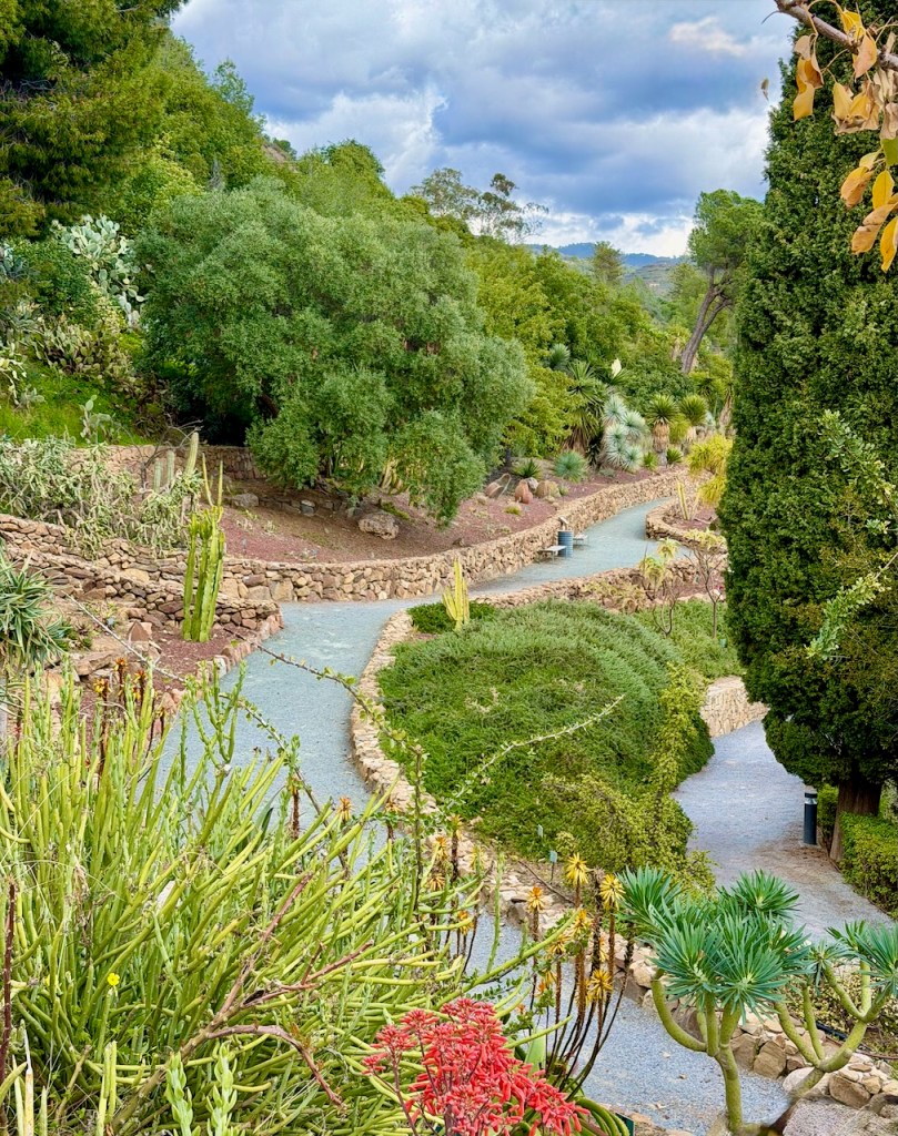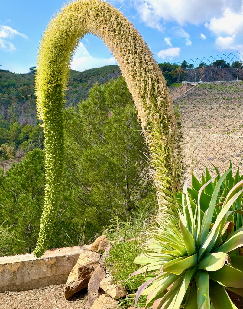 Sateisen maaliskuun jälkeen 2025 täällä oli näkyvissä myös kukkivia kaktuksia ja huikea jukkapalmu. Kaktusten ja palmujen ympäristökin oli vihreämpi.