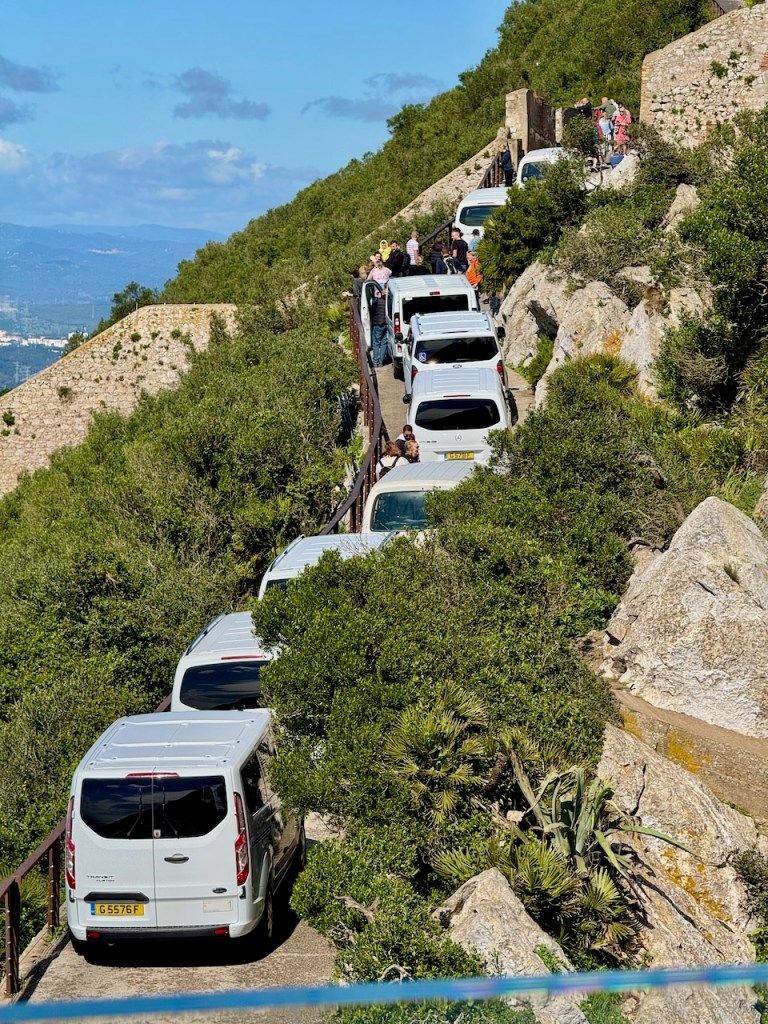Kävellen sitten suunnistettiin rajalle ja vilautettiin passit tarkastajille. Heiltä tuli lähinnä hymy ja peukku, eikä kävelyä tarvinnut tässä edes hidastaa. Viimeisen tarkastuksen jälkeen poimimme sitten infosta kartan ja saman tien meille alettiin aika aggressiivisesti myydä taksin tekemää kahden tunnin ajelua ylös Gibraltarinvuorelle. Olimme sellaista vähän harkinneet jo etukäteen, joten sanoimme yes ja maksoimme kahden hengen ajelusta 98€. Aika paljon. Kokemus oli niin hyvä, että uudelleen käydessämme 2025 teimme saman ilman muuta.