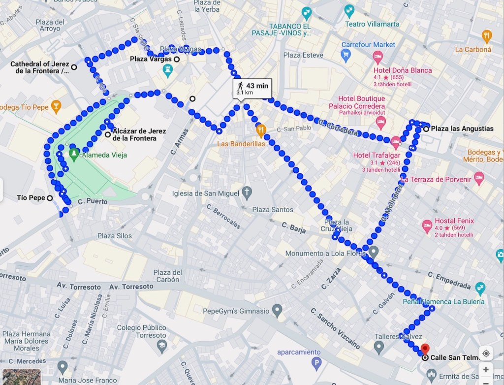Tällaisen reitin teimme. Oikealla alhaalla on Calle San Telmo, jolta löysimme sopivan parkkipaikan.