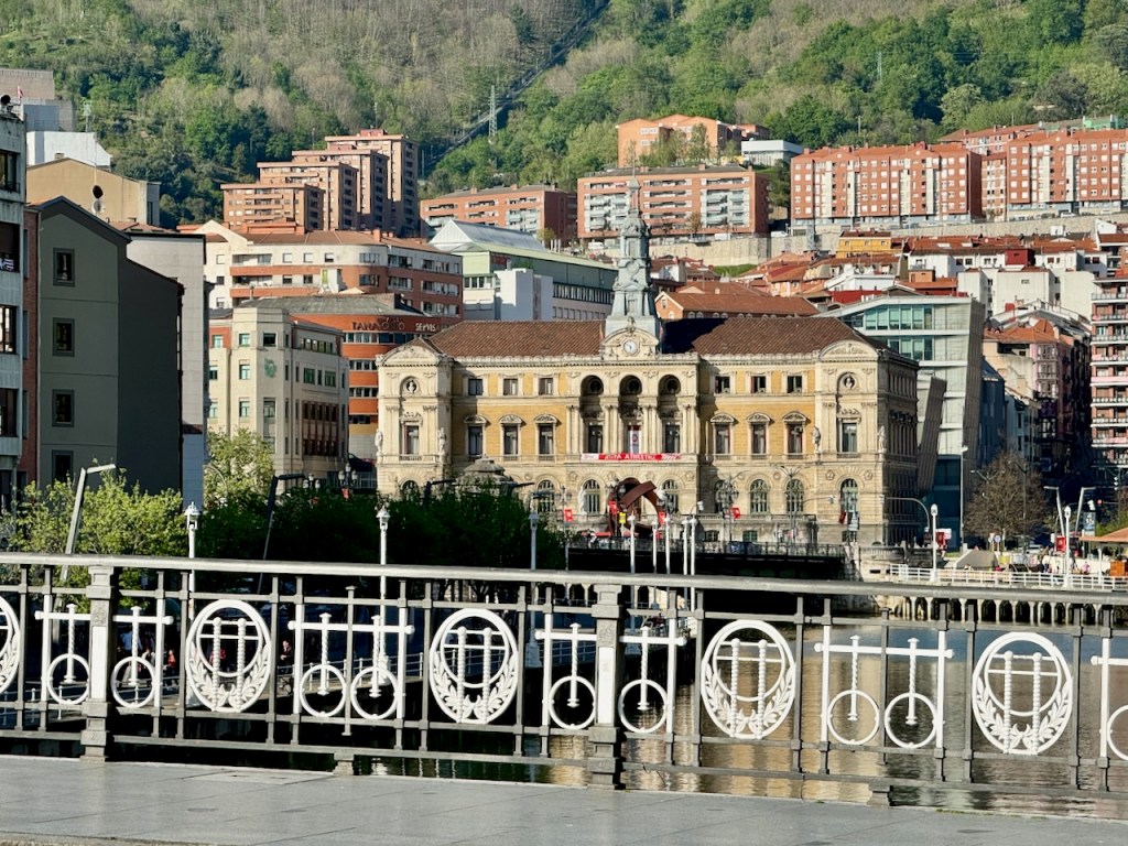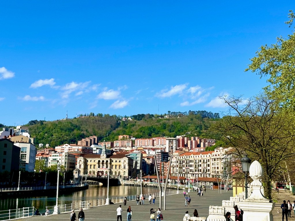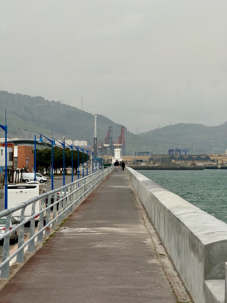 Joen toisen rannan kävely oli pelkkää nautintoa sateisen aamupäivän jälkeen. Aurinko paistoi, näkymät olivat kauniit ja myös Pedro Arrupe -kävelysilta varsin erikoinen.