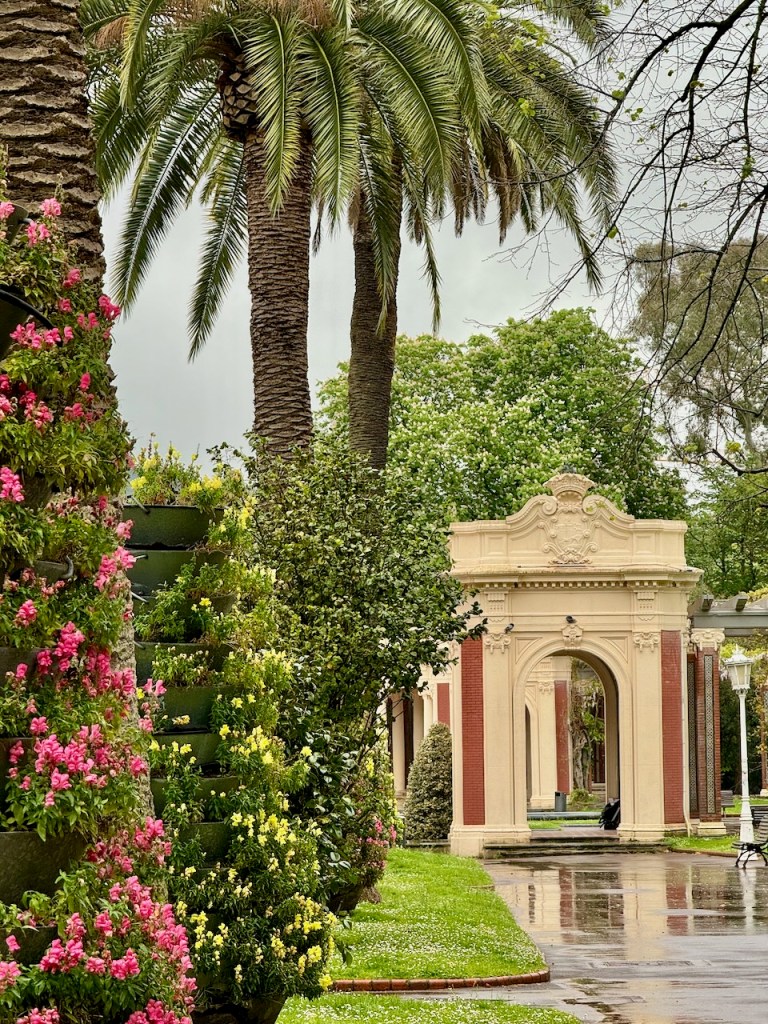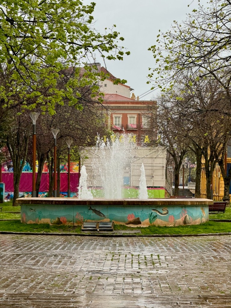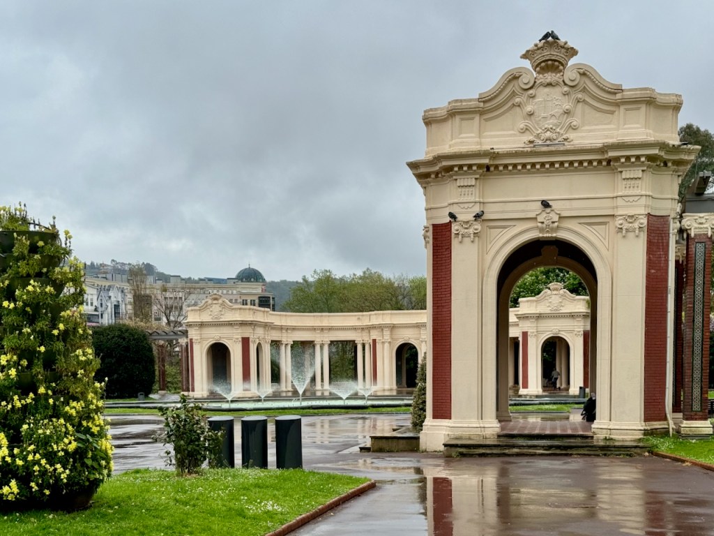 Nyt jouduimme avaamaan sateenvarjot. Tulimme aivan ihanaan Doña Casidan puistoon ja sen keskellä olevaan pylväskäytävien reunustamaan Pergolaan ja kappeliin, joiden edessä on näyttävä suihkulähde.