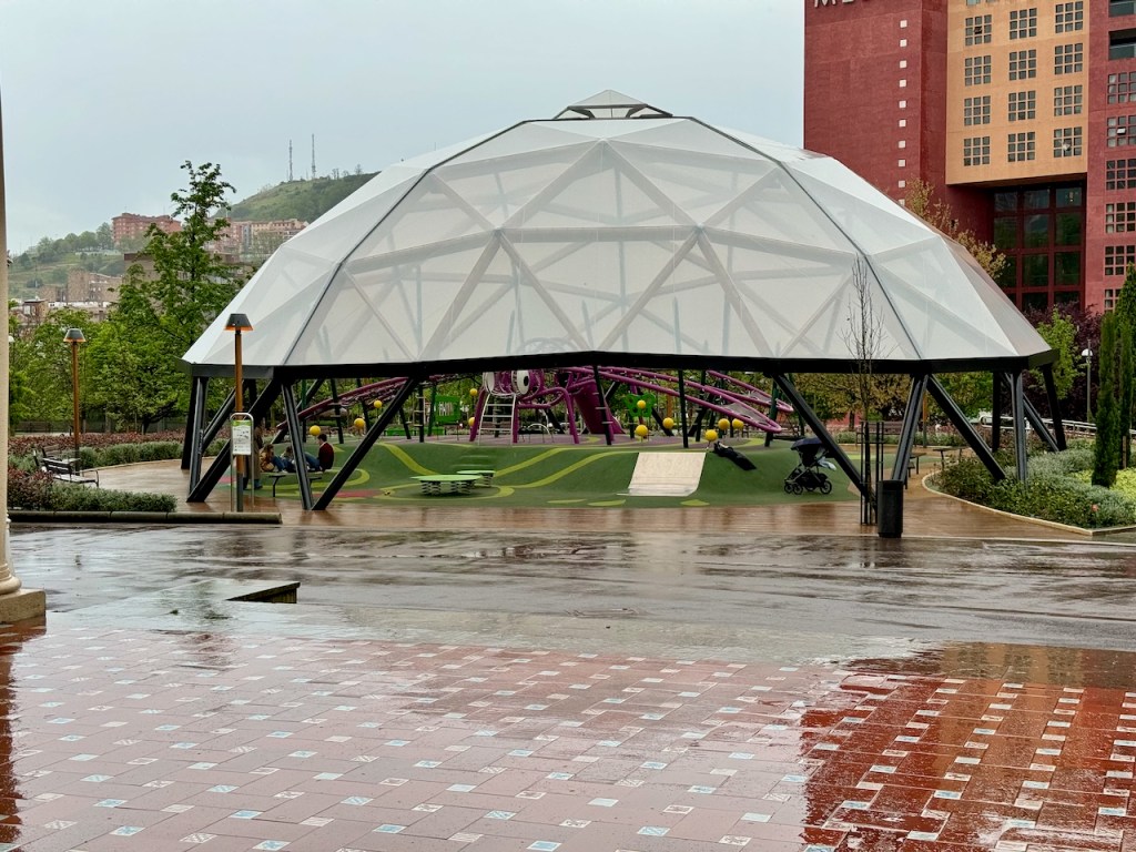Pylväskäytävien vieressä on myös lapsille leikkipuisto. Olipa hyvä idea, että leikkipuisto oli sateella katettu.