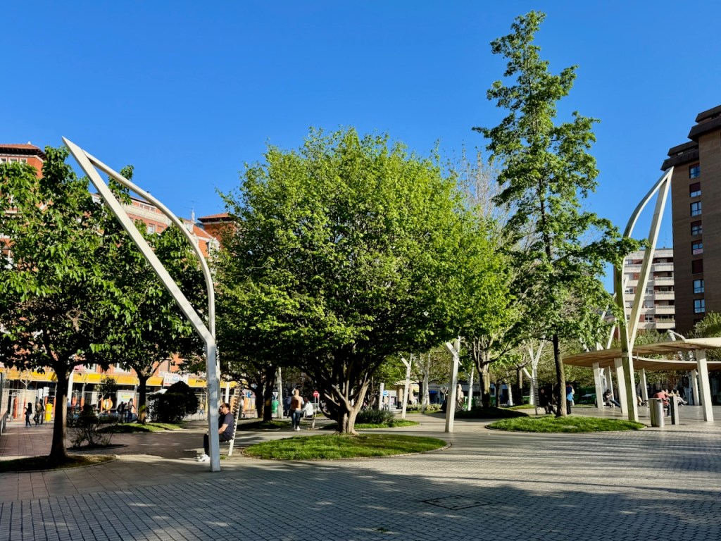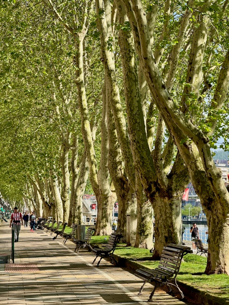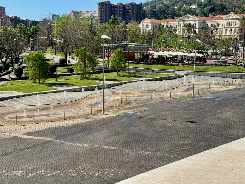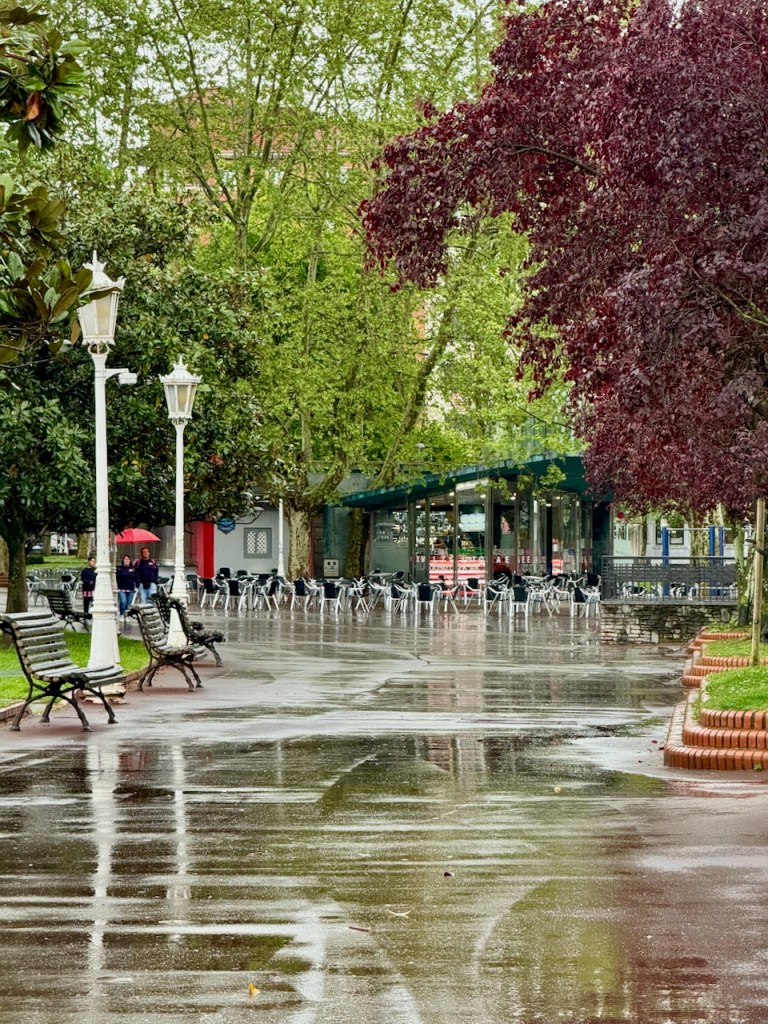 Pylväitten takana jatkuu myös viihtyisää puistoa, joka oli kovin tyhjää tällaisena sadepäivänä. Terassien tuolimääristä päätellen ei kylläkään tavallisesti. Bilbaohan on myös suosittu tapasravintoloiden ja muunkin ravintolatarjonnan takia.
