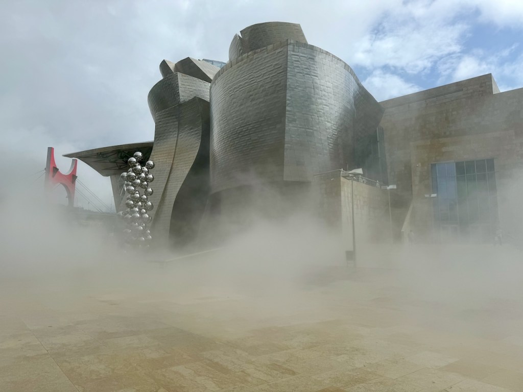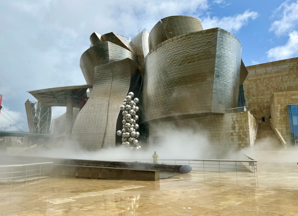 Sitten näimme saapuneemme Guggenheimin museon nurkille. Mutta hei, mitä tämä on! Emme keksineet, vaikka seurasimmekin tätä jonkin aikaa. Jotenkin näytti, että se olisi liittynyt aamupäivän sadekuuroihin ja jotenkin näytti siltä, että vihreään suojapukuun pukeutunut mies päästi vettä jonkun kuumentavan sulun läpi. Oli kuitenkin näyttävän näköistä tehostetta tälle hienolle rakennukselle.