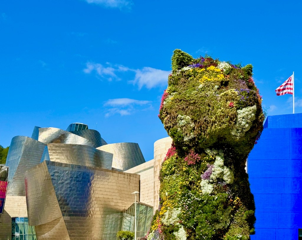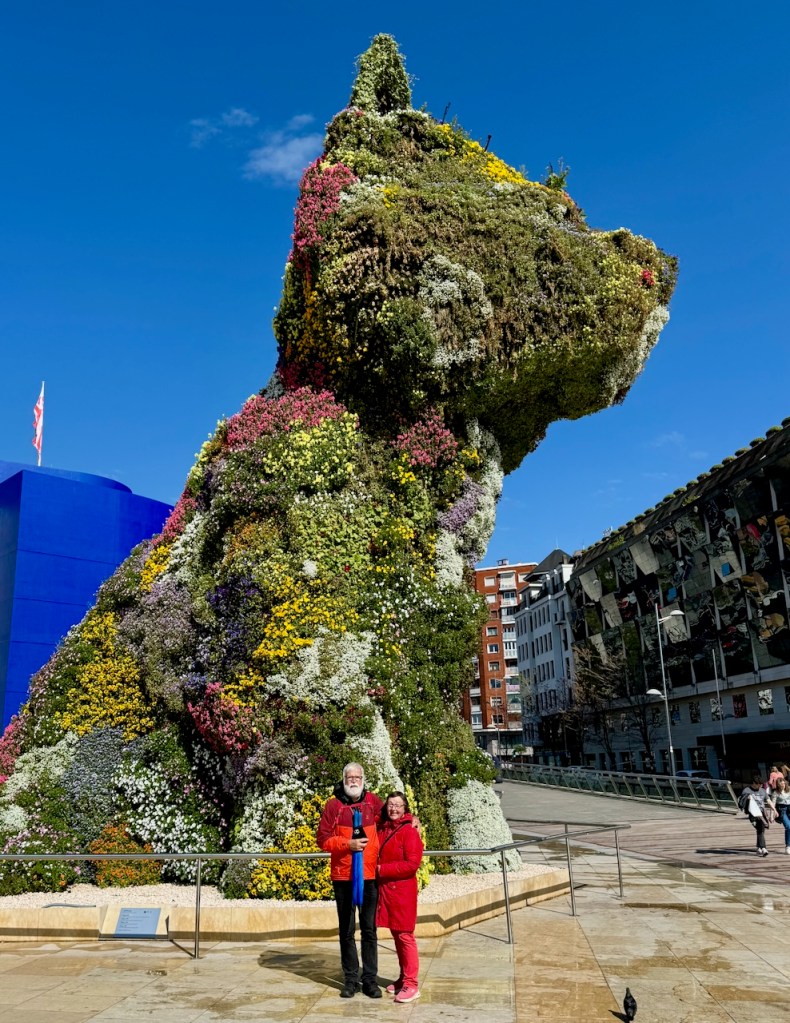 Guggenheimin museon edessä istuu jättimäinen koiranpentu Puppy, joka on tehty pelkistä kukista. Taiteilija Jeff Koons suunnitteli teoksen museon avajaisia varten, mutta kaupunkilaiset ihastuivat lemmikkiin niin, että se jätettiin paikalle. Nyt se on varsinainen selfietausta, jonka edessä saa omaa vuoroaan jo jonottaa. Aika huikea teos, luin jostain, että se sisältää 38 000 kukkaa, jotka uusitaan kaksi kertaa vuodessa. On siinä hoitamista. (Sanoo kukkivan pihan omistaja.)