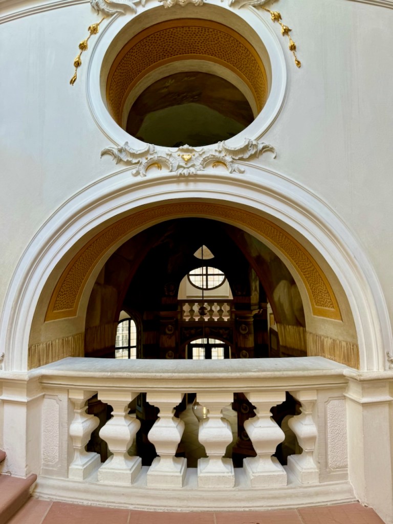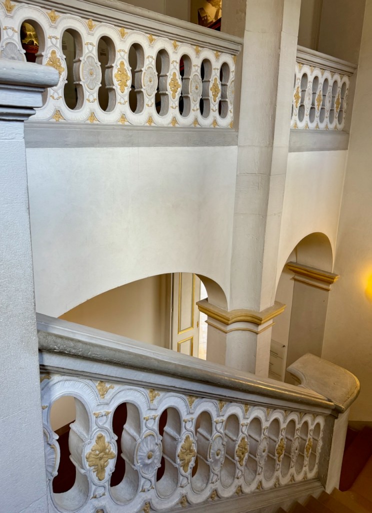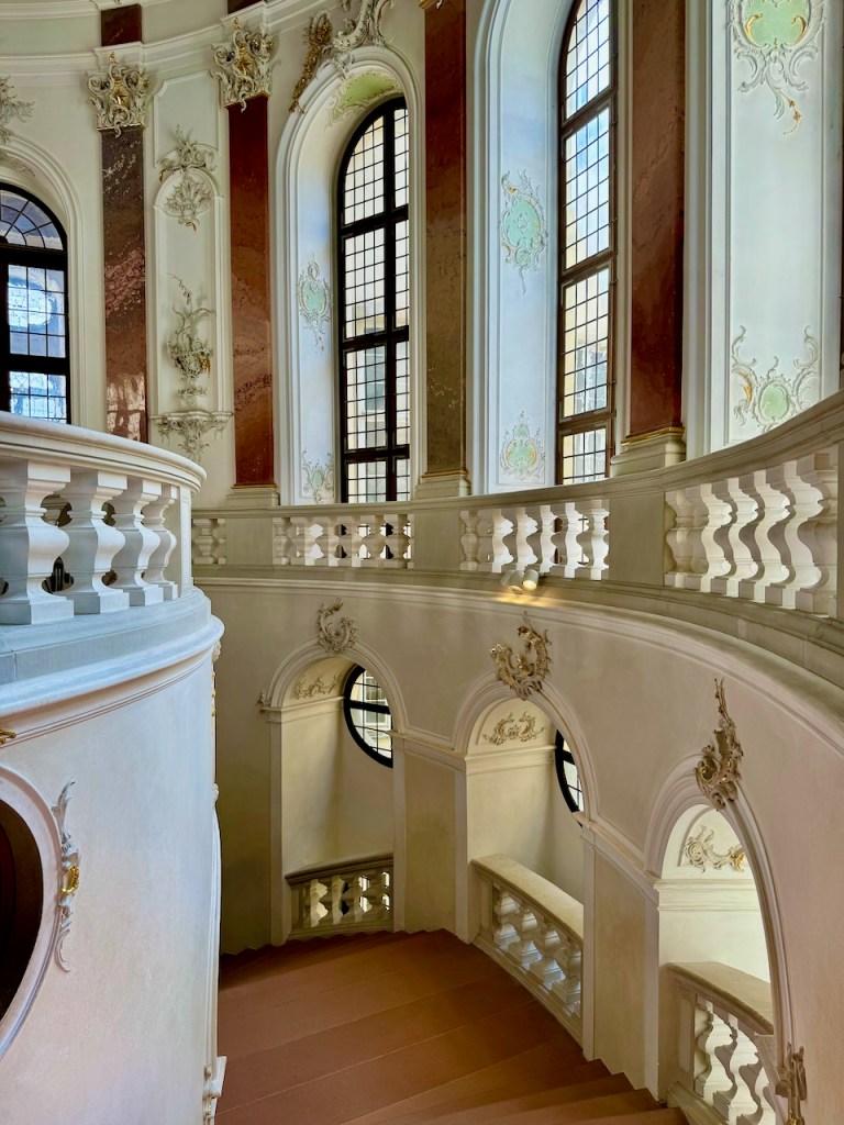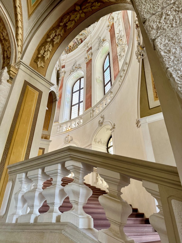 Palatsi on erityisen kuuluisa arkkitehti Balthasar Neumannin suunnittelemasta vaikuttavasta portaikosta: ”kaikkien barokkiportaikkojen kruunu”. Oli vaikuttava portaikko todellakin, joka suunnasta mahtavaa näkymää.
