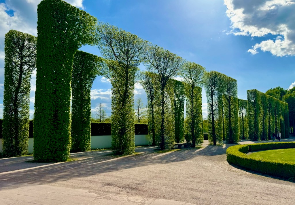 Näyttävästi leikattuja pensasaitoja, melko korkeitakin.