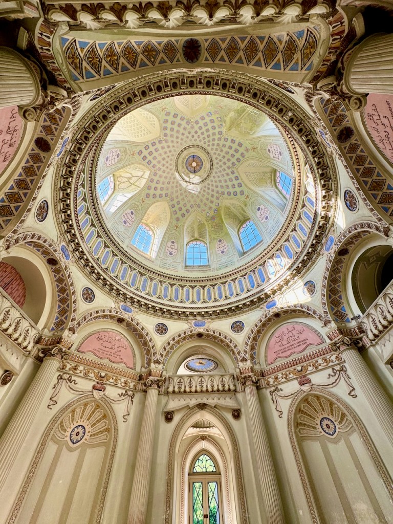 Sisälle moskeijaan pääsi vapaasti, eikä siellä ollut kanssamme ketään muita. Moskeijan sisätilat jakaantuvat pylväiden avulla värikkäiksi syvennyksiksi. Arabiaksi ja saksaksi kirjoitetut kirjoitukset viittaavat hyveisiin, kuten viisauteen, työllisyyteen ja harkintaan. Näkymä kupolin huipulle on vaikuttava.