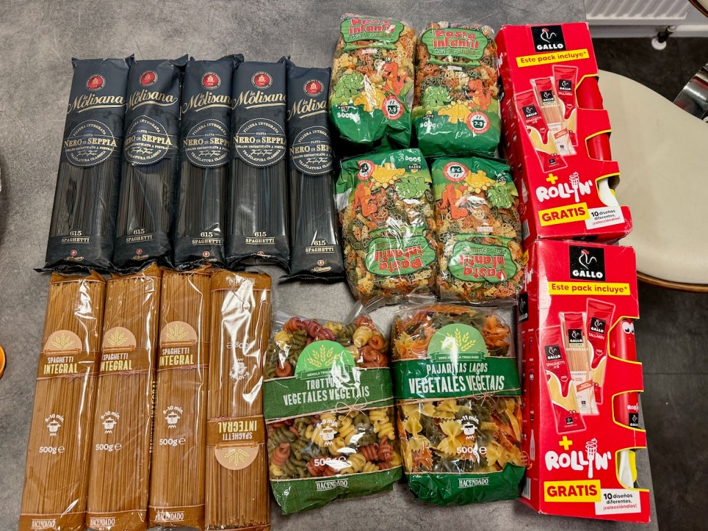 Viinipullot siis ostettiin jo Espanjasta, noin 40 pulloa mahtui. Muutama muukin tuliaistoive hankittiin jo sieltä. ”Meillä kuluisi pastaa vaikka kuinka paljon” ja ”Mustekalapastaa olisi kiva maistaa” -vihjeet hankittiin jo sieltä. Ja toivomuksesta myös nämä punaiset karkit ja jonkin verran suklaatakin.