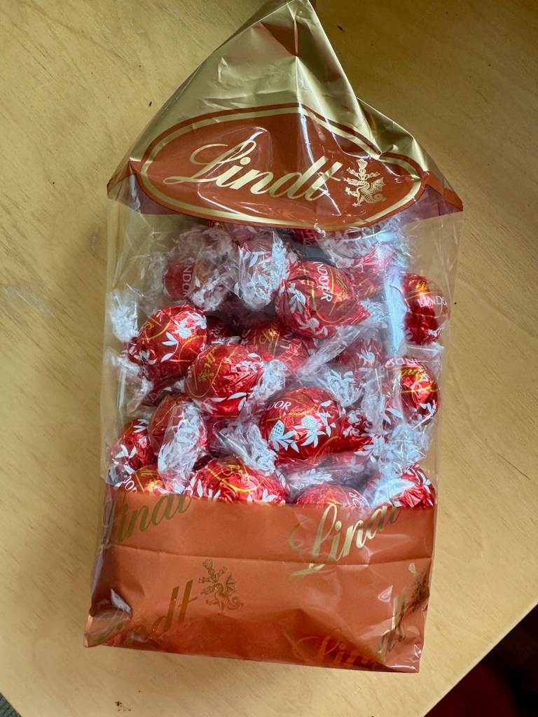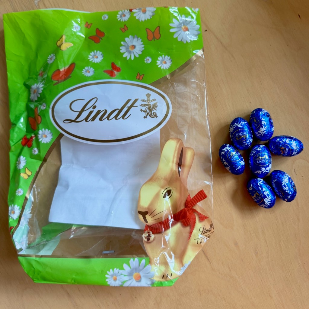Siellä on myös Lindtin myymälä, jossa usein saattaa olla tarjouksia. Ja hinnat ovat joka tapauksessa lähempänä puolta siitä, mitä Suomessa, eli tuomme usein herkkuja ihan lasten juhlatarjoiluihin. Niin nytkin. Konvehtipusseista on yhdestä jämät jäljellä, muut vietiin jo. Ja pääsiäismunat hävisivät heti, kun lapset kävivät, vaikka olin kaikki piilottanut kotiimme eri paikkoihin.