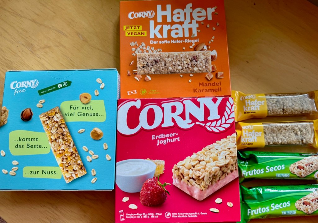 Neljäs rutiini on Schwartaun outlet. Schwartaun hilloja ei enää Suomessa edes myydä, ja täältä saa hillopurkkeja noin eurolla. Osa on tuotekokeiluja, ja jotkut niistä esim ”Weniger Zucker” purkit ovat kelvanneet hyvin. Viime vuosina täällä on ollut myös Corny tuotteita ja niiden hinnat ovat houkutelleet ostamaan sekä myslejä että välipalapatukoita. Patukoitten hinnat ovat olleet tosi alhaisia verrattuna Suomen hintoihin. Juuri näin, että jotkut Corny patukat olivat Tokmannilla tarjouksessa 0,69€/kpl ja me ostimme näitä 0.90€ – 1,20€ /neljän tai kuuden kappaleen rasia.