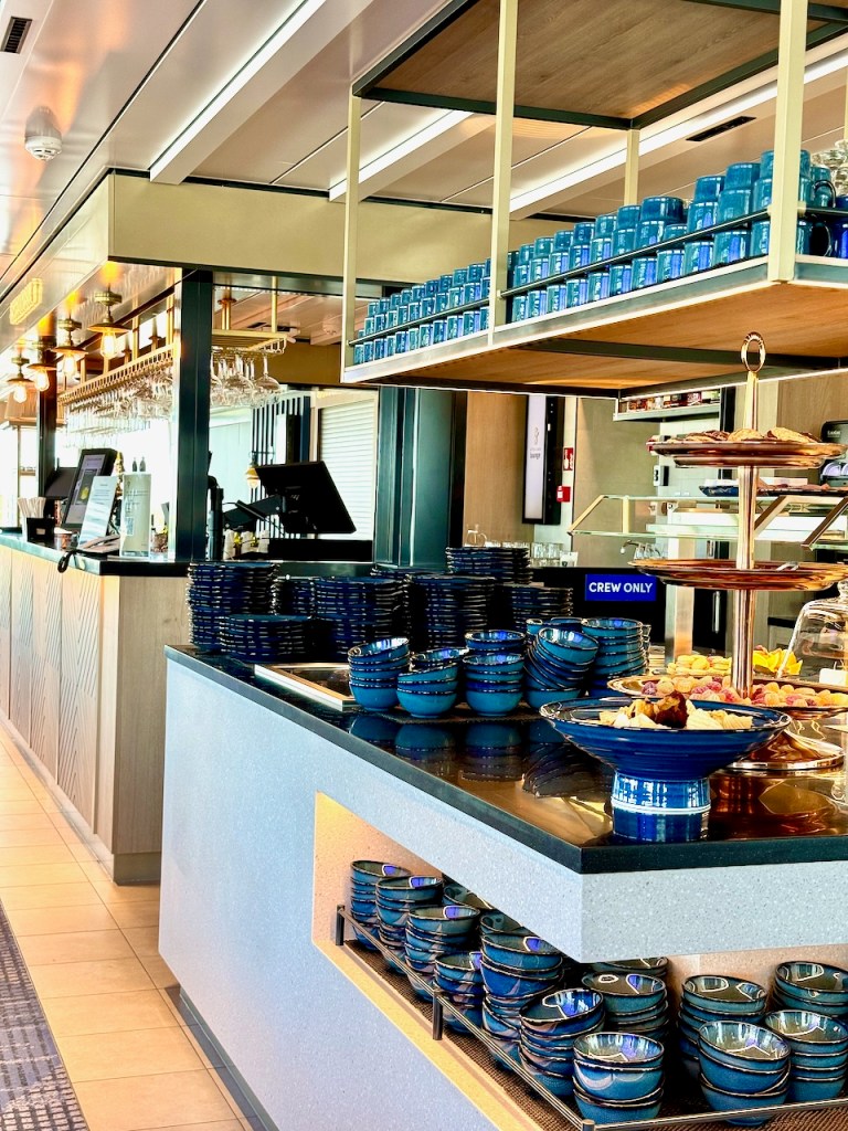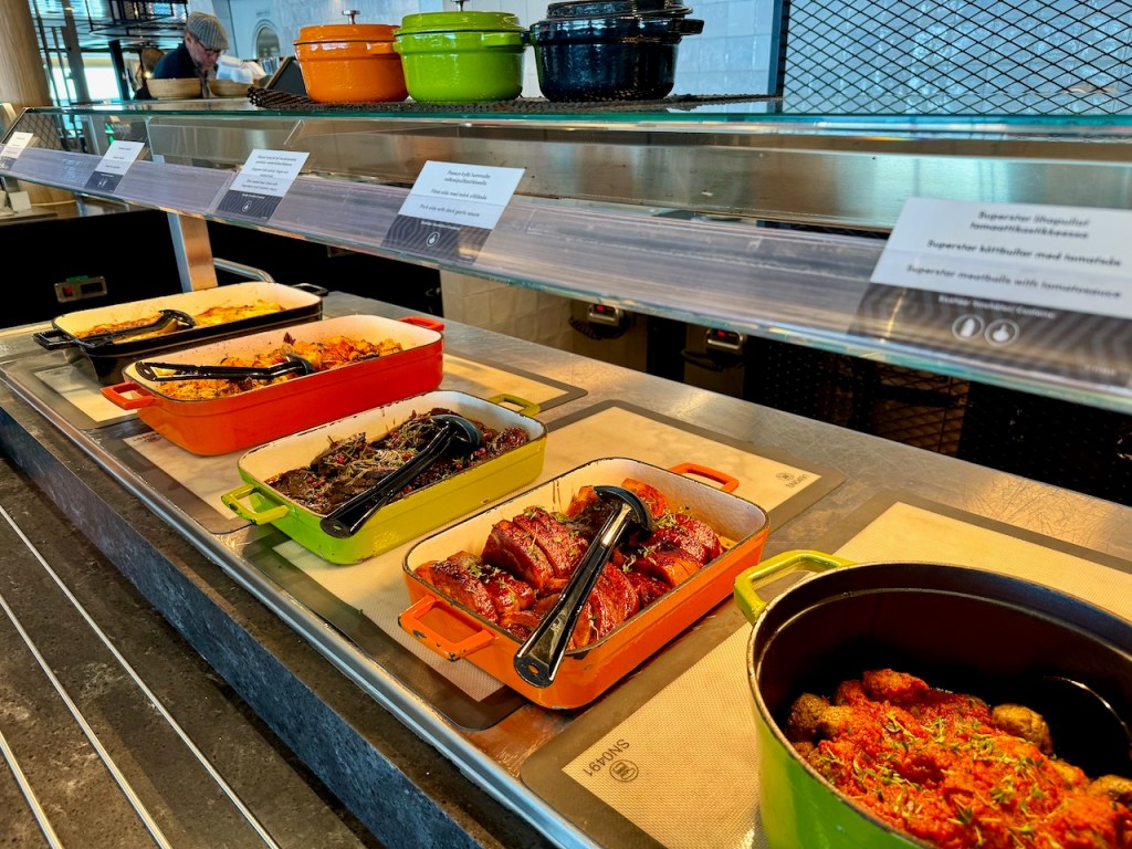 Cargo Buffet on Stellar Loungen vieressä ja erittäin viihtyisä. Pöydissä on mukava istua ja samalla katsella isoista lasiseinistä merimaisemia. Kuulimme matkallamme myös ruokalajien ideoista. Niissä käytetään paikallisia raaka-aineita ja seurataan paikallisia ruokaperinteitä. Suuri osa pöydän antimista on lähi- ja pientuottajilta peräisin, on paikallista kalaa, lammasta ja vegaanisia ruokia. Pitkällä buffetpöydällä nämä ovat eri puolilla.