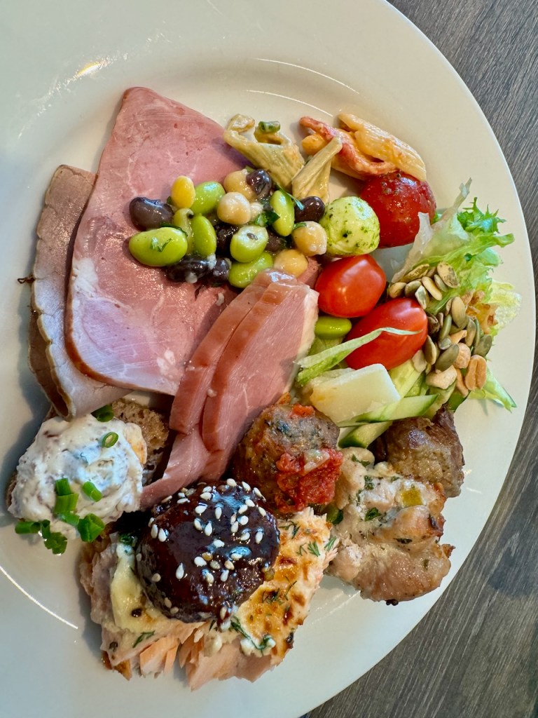 Kertomustani aloittaessani kirjoitin, että matkalla kohtasin yhden ongelman. Se oli tässä. Buffet-tiskien tarjonta oli niin monipuolista ja herkullisen näköistä, että keräsin itselleni isomman annoksen, mitä pystyn yleensä syömään kerralla, vaikka valikoin vain omat suosikkini. (Moni muu pystyisi kyllä herkuttelemaan enemmänkin.)