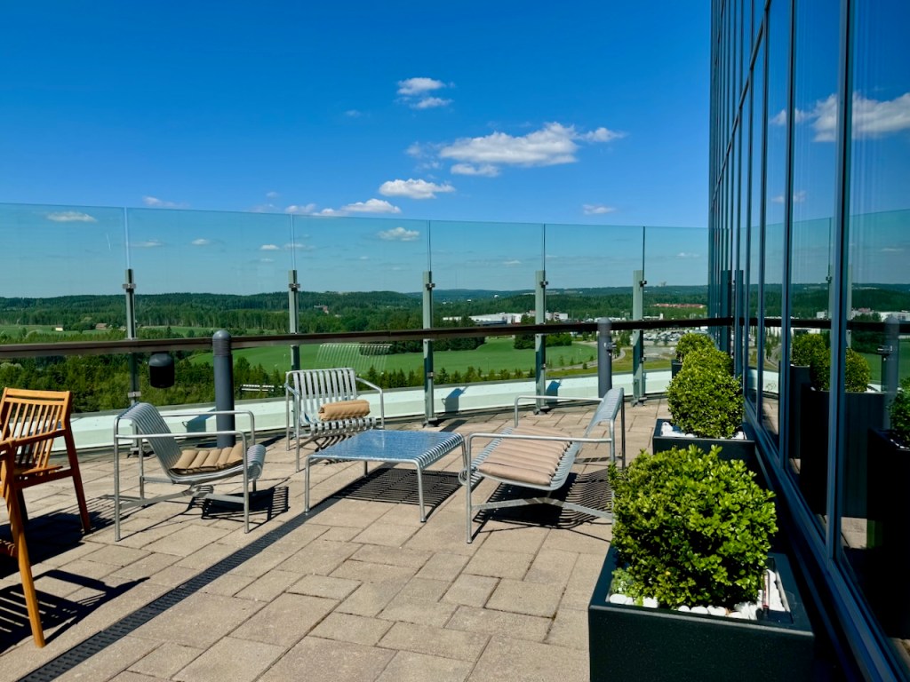 Yhdennessätoista kerroksessa on tosi kiva ravintola, jossa kauniilla säällä voi siirtyä terassin puolelle nauttimaan ruoasta + kahvista + maisemista samaan aikaan.