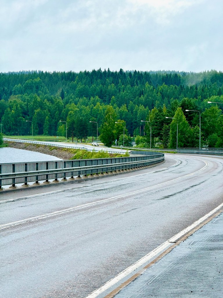 Jatkoimme matkaa. Ei ollut huono reittivalinta. Järvien ja siltojen lisäksi metsää, metsää, metsää. Tien pinnassa oli vähän vaurioita, mutta ei paha.