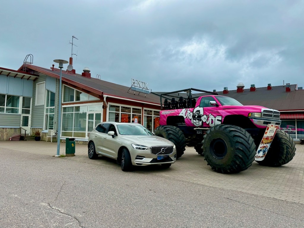 Pihalla oli myös hauska maastoauto, joka mainosti paikallista autotapahtumaa ja meidän pieni (?) Volvomme halusi viereen sitä katsomaan.