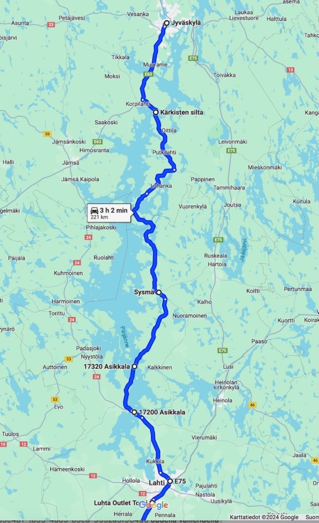Tällaisen reitin olimme ajaneet nelostien lisäksi. Jyväskylään mennessä Vääksy, Pulkkilanharju, Sysmä ja Jyväskylästä tullessa Kärkisten sillan ja Judinsalon kautta Sysmään.