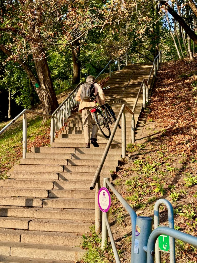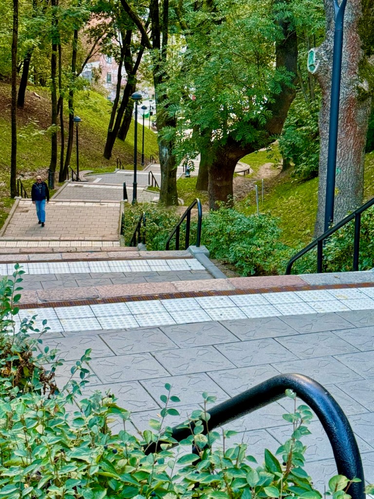 Sitten tiemme erosivat hetkeksi. Juha käveli suoraa ylämäkeä Jeesuksen ylösnousemuksen kirkkoa kohti ja minä käännyin portaille Vytautasin puistoa kohti. Ei näyttänyt kovin pahalta, kun kerran joku nuorempi kantoi vielä taakkansakin.