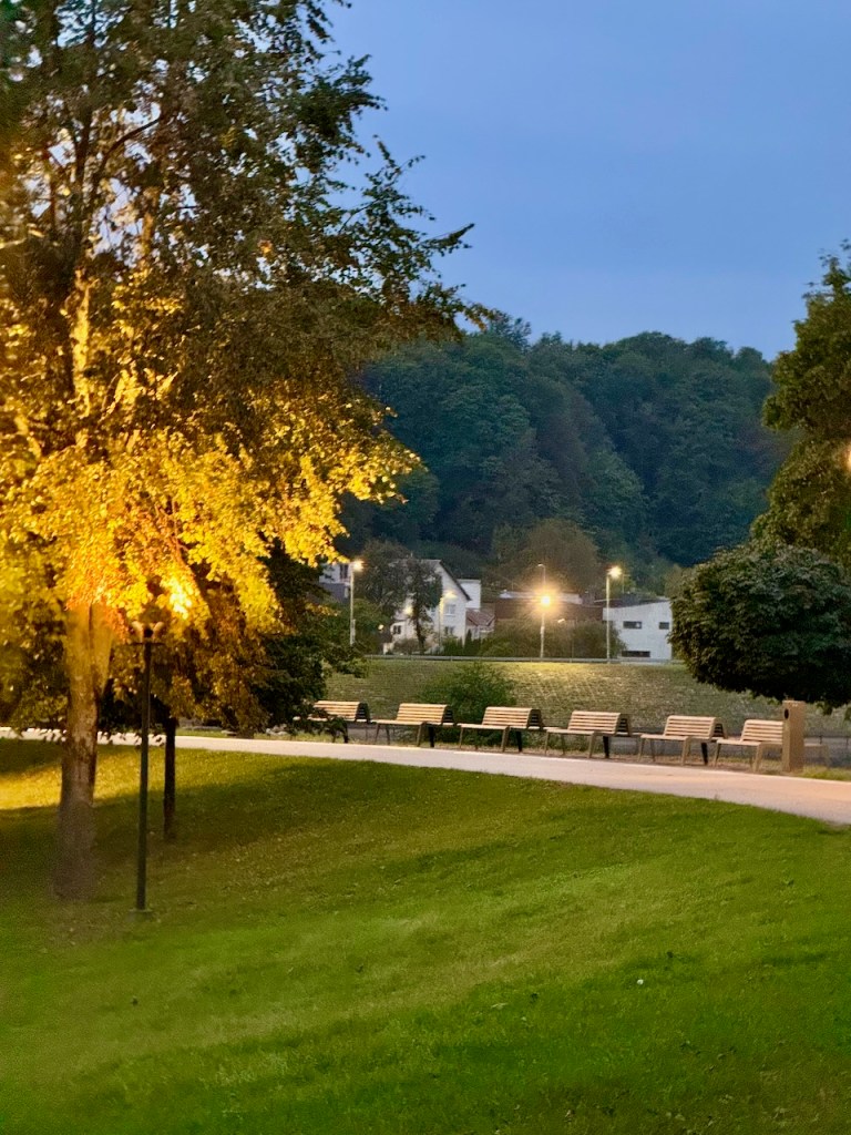 Palasimme takaisin suunnilleen samalle reitille, jota olimme jo vanhassa kaupungissa kävelleetkin. Valaistus oli niin uusi, että nähtävyydetkin olivat uudenlaisia. Kirkontornit valaistuja ja vanha Kaupungintalokin komea. Kävelykadun terassit kovin tyhjiä.