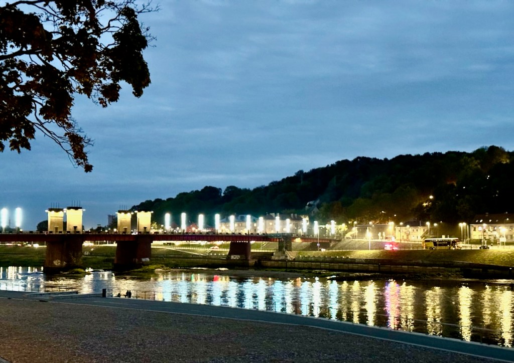 Sitten kävelimme rantaa pitkin Kaunasin vanhaankaupunkiin johtavan sillan lähelle, joka oli komeasti valaistu.