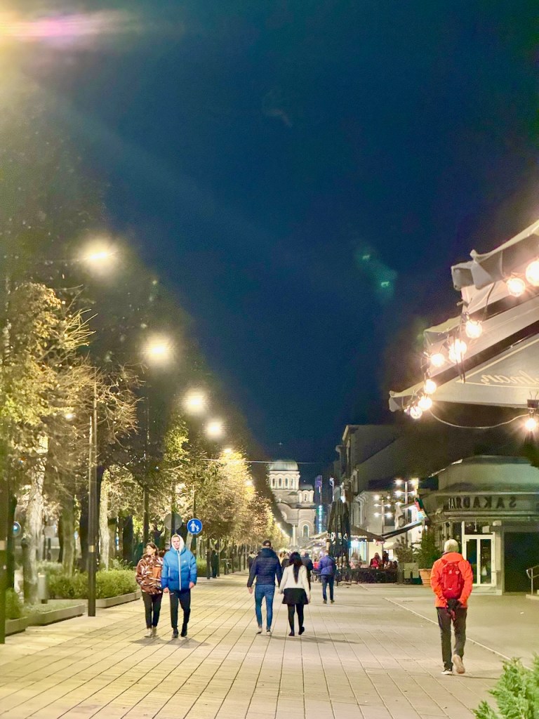 Kaupungin sydämeksi kuvataan Laisvės Alėjaa, joka on lähes kaksi kilometriä pitkä kävelykatu, joka kulkee vanhankaupungin läpi. Kadun varrella on paljon ravintoloita, kahviloita, kauppoja ja myös suosittuja hotelleja. Tältä siellä illalla näytti iltakävelymme jälkeen. Tässä ensin kartta koko kävelystämme.