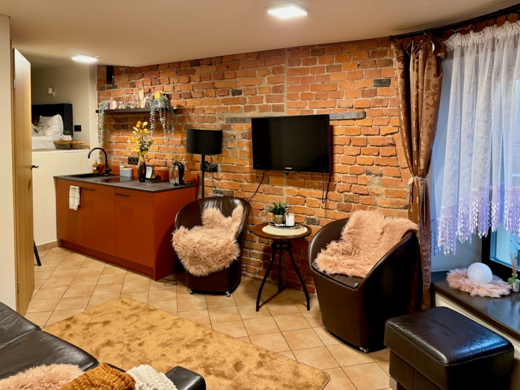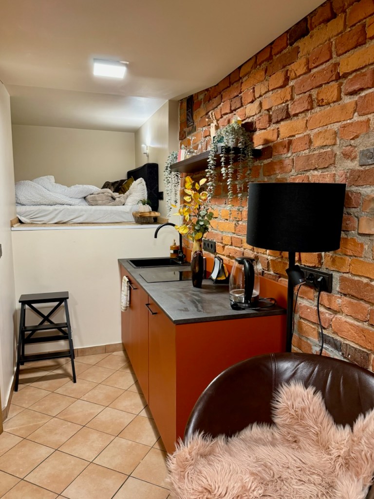 Ja tässä on se juttu, miksi ei kelpaa meille toista kertaa. Bookingin esittelyn kuvista sai huoneistosta aivan toisenlaisen käsityksen, samoin varauksesta. Tämä oli pienempi, ja sänky oli noin 150cm korkealla seinän sulkemalla parvella. Sinne piti kiivetä irtojakkaralla, emmekä edes molemmat mahtuneet sinne.