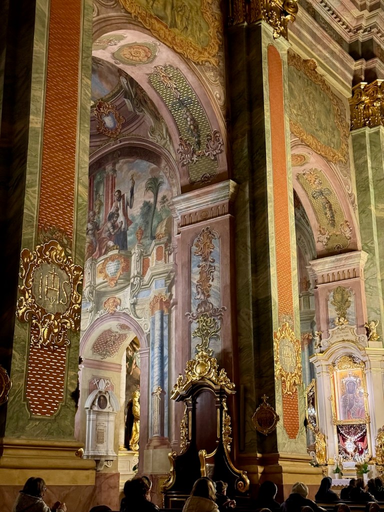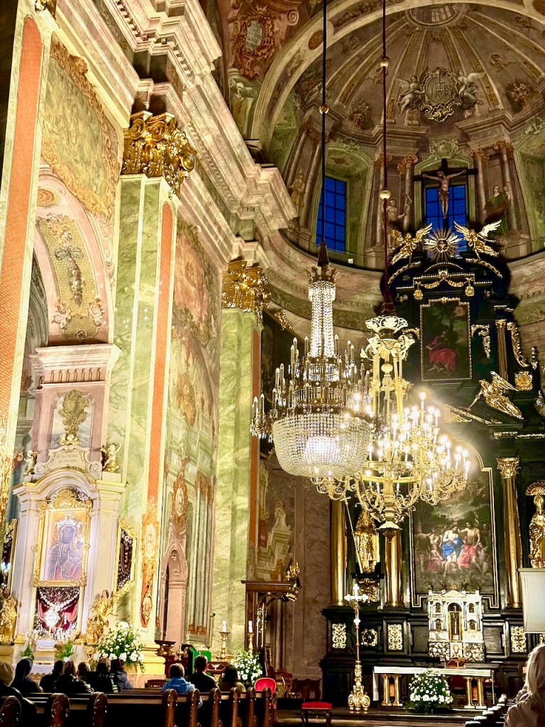 Tornin vieressä on Pyhän Johannes Kastajan katedraali tai yksinkertaisesti Lublinin katedraali, joka siis on Lublinin roomalaiskatolisen arkkihiippakunnan katedraali. Se rakennettiin vuosina 1592–1617 Jeesuksen seuran kirkoksi ja on Lublinin suurin kirkko. Katedraalin alla on kryptoja, joissa voi vierailla. Meidän vierailumme osui hetkeen, jossa kirkossa oli menossa illan jumalanpalvelus. Olimme mukana hetken ja ihastelimme penkissä istuen suurta kaunista kirkkoa, vaikka kiertelemään ei nyt voinutkaan mennä.