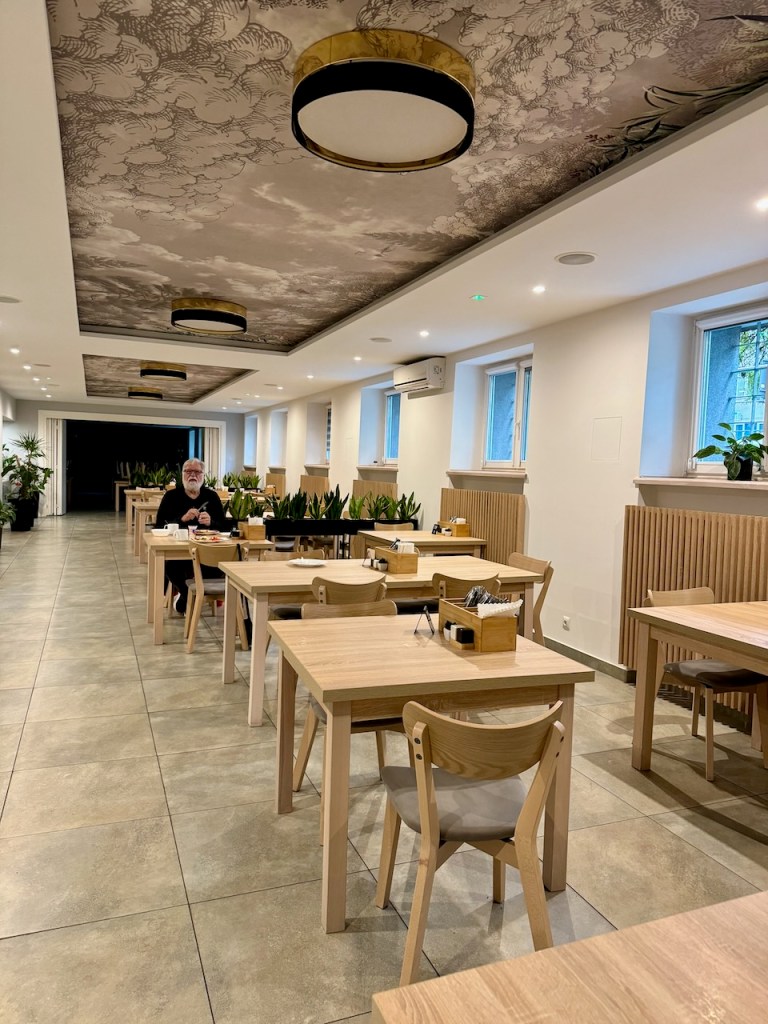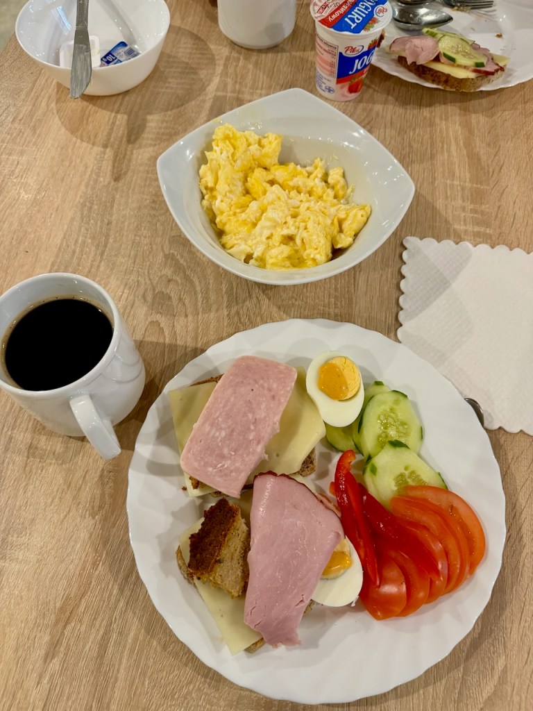 Huone oli melko pieni, mutta asiallinen ja meille ihan riittävä yhdelle yölle. Huoneessa ei ollut mahdollisuutta tehdä itse aamiaista, eikä itse hotellissa ollut sellaista tarjolla, mutta kadun toisella puolella oli kahvila, josta voi varata aamiaisen. Oli oikein sopiva buffet meille. Kahvit, jogurtti, leivät, munakas, leikkeleet, juustot ja vihannekset.