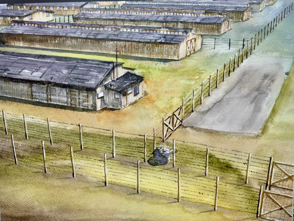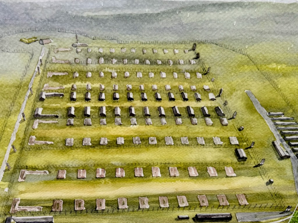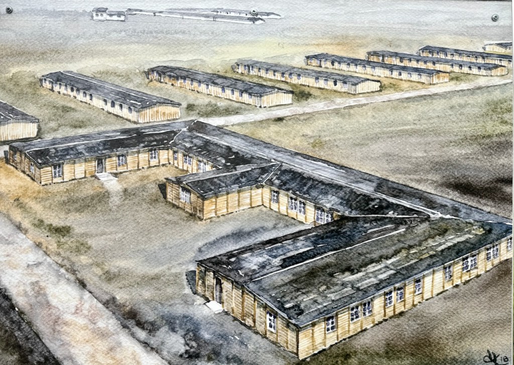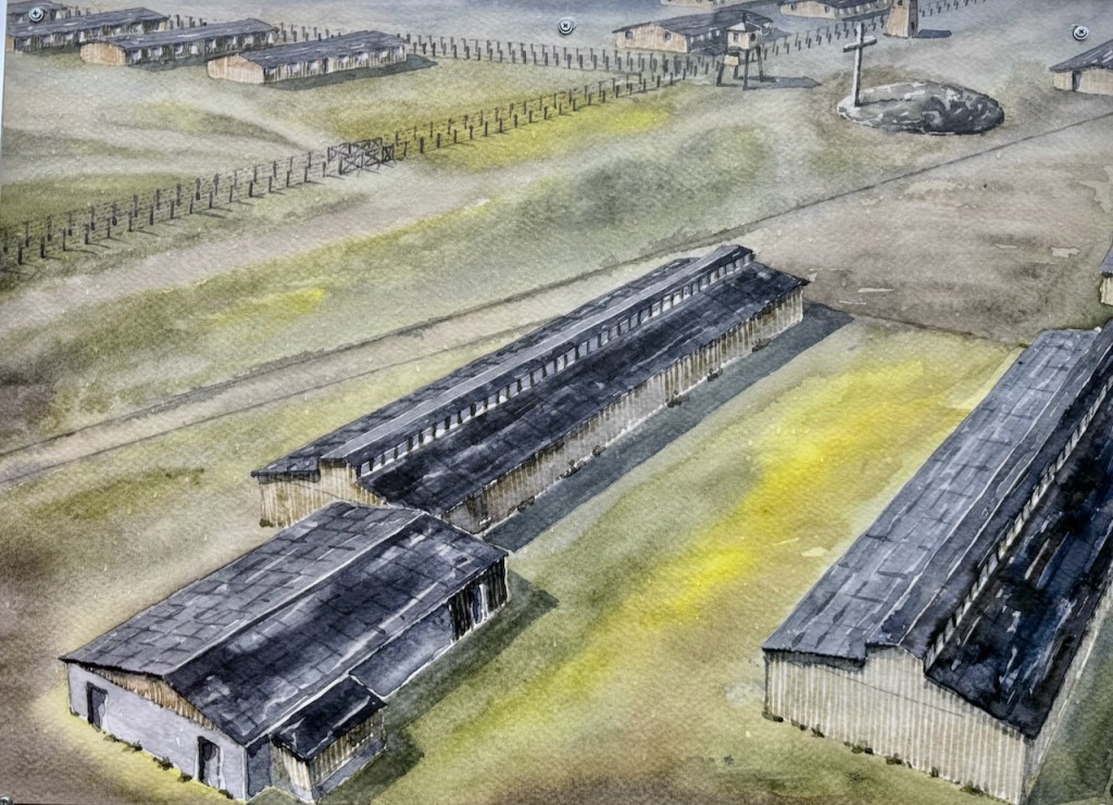 Visualisointi SS-upseerin messuhallista ja vartiokasarmista syksyllä 1942 (etualalla). Saksalaiset aloittivat vartiopataljoonan kasarmin rakentamisen helmikuussa 1942. Silloin pystytettiin kasarmirivi messuhallin taakse. Taustalla näkyy leirin lääkärin talo ja leirin tilojen laajentamiseen käytettyjen materiaalien varasto.