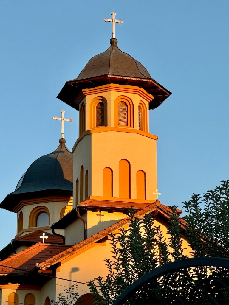 Ja sitten iltakävelylle Sebesin pieneen kylään. Nättejä rakennuksia ja kävelyyn mukava puisto joen varrella. Ei mitään kovin erikoista, mutta taloja, portteja ja yksi kirkkokin. Emme kylläkään kävelleet ihan keskustaan asti.