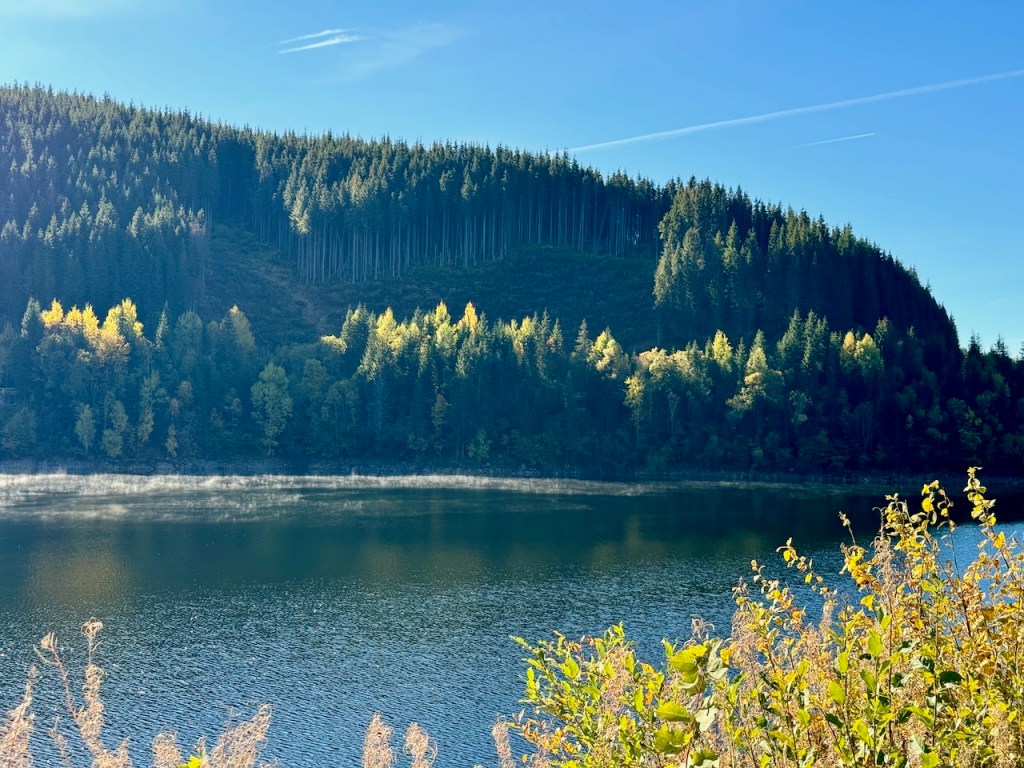 Sebesistä etelään päin lähtiessä alku on loivaa nousua keskellä metsää. Rinteet olivat jo ruskan värittämiä näin lokakuun alkupuolella. Alkupäässä tien varrella on paljon myös havupuita.