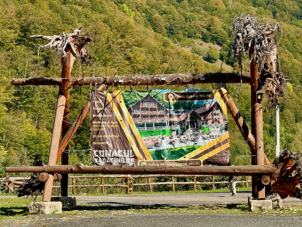 Ja ihan uskomattoman villin näköinen Conacul Radacinilor -ravintola ja majapaikka. Sen vieressä oli joki, jossa oli pientä putousnäkymää. Olisikohan tällainen ollut hauska? Näin Bookingista, että hinta olisi ollut 60€/yö