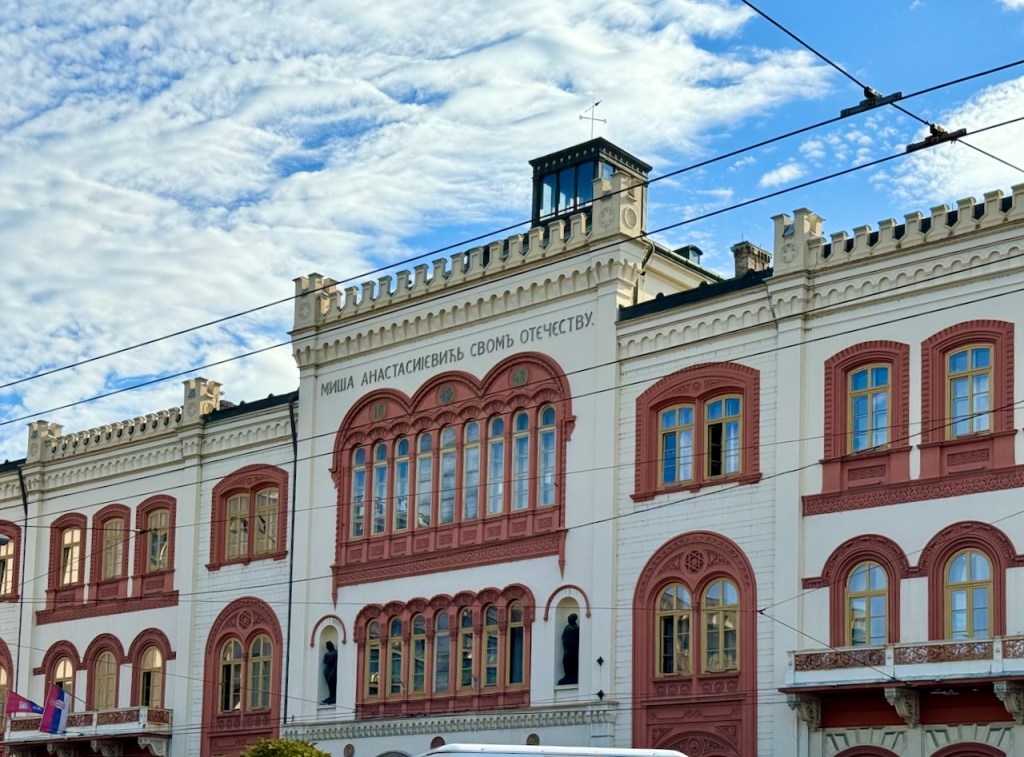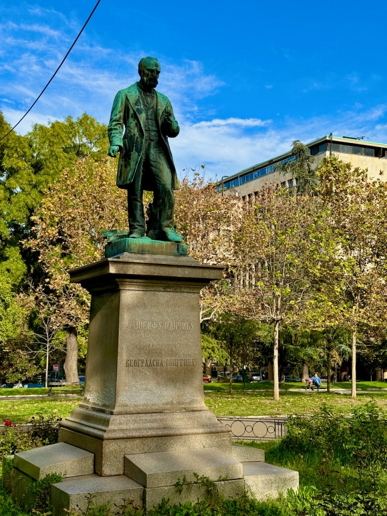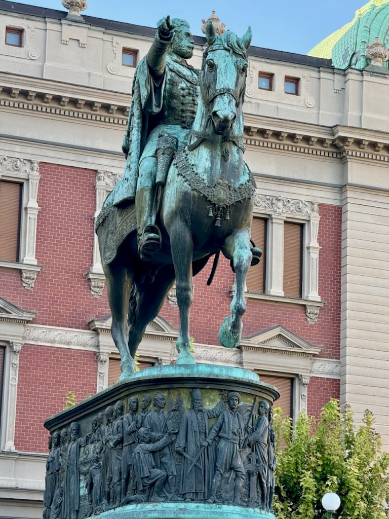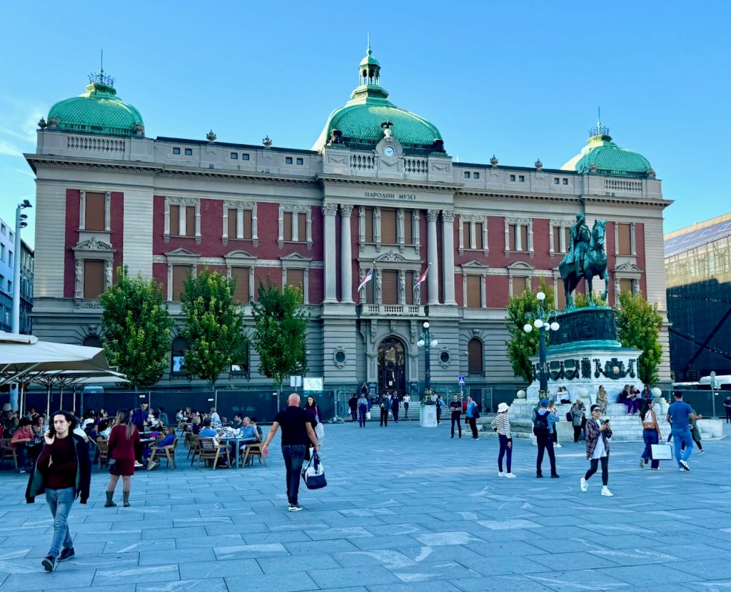 Punaruskea komea rakennus patsaan takana on Serbian kansallismuseo.