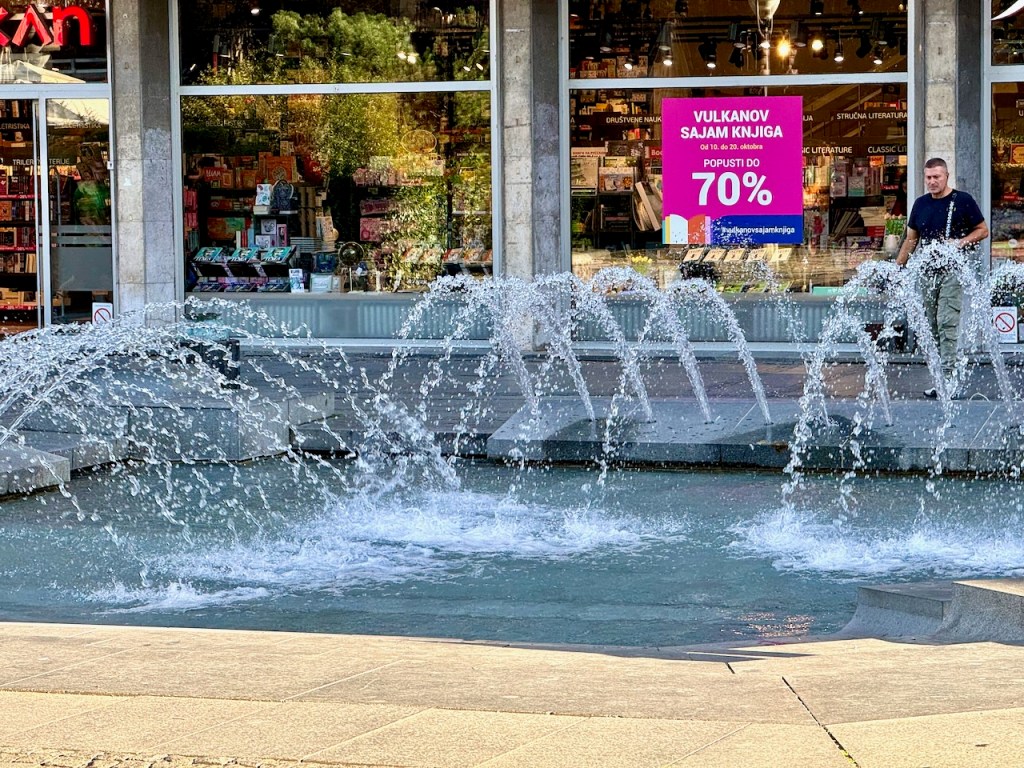 Pieni poikkeaminen Akademski Platon suositulla suihkulähteellä. Vieressä on viihtyisä kahvilaterassi ja lähteen vierellä ihmisiä lapsista vanhuksiin. Ilmeisesti täyttivät jopa pullojaan.