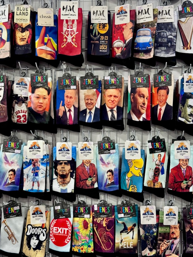 Emme olleet enää kävelykadulla ja seuraavassa liikenneympyrässä ei näyttänyt olevan tilaa jalankulkijoille ollenkaan. Mutta onneksi tajusimme, että risteyksen ali voi kulkea tunnelin kautta. Tunneli oli ihan selvästi sekin tarkoitettu turisteille. Kansainvälisille. Wienistä oli muistot Klimtistä ja sukkien kanssa voi ottaa kantaa politiikkaankin. Tai musiikkiin ja muuhun kulttuuriin.