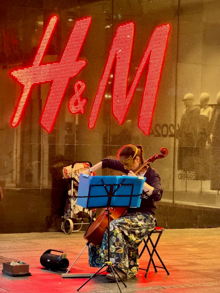 Kävelykatu oli kyllä aivan turisteille avoinna vieläkin. Soittajia, matkamuistoja, ja kansainvälisten kauppaketjujen myymälöitä.
