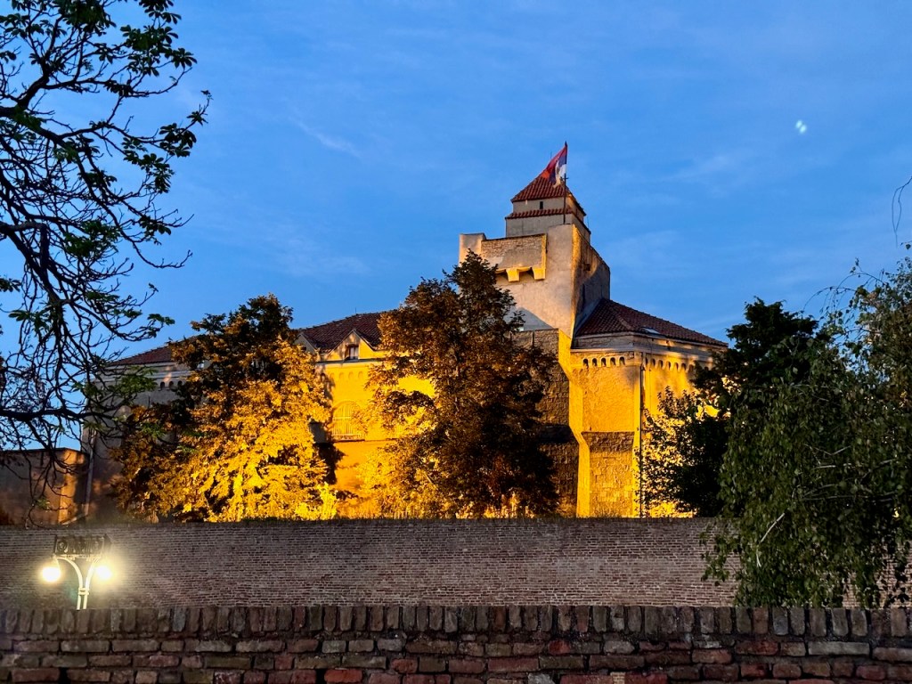 Linna oli kauniisti valaistu näin illallakin ja lähellä olevan Pyhän Mikaelin Katedraalin torni näkyi puiden takaa.