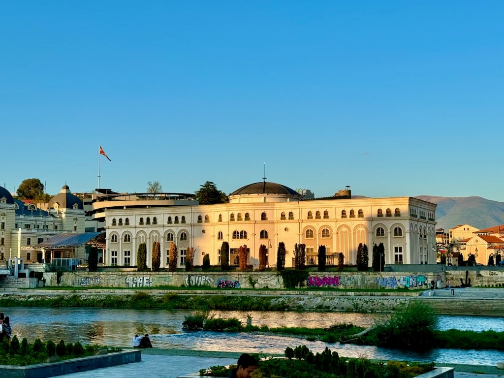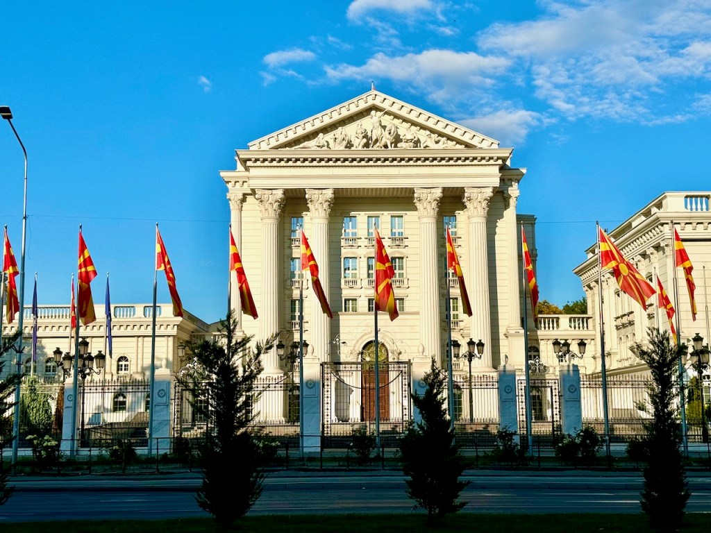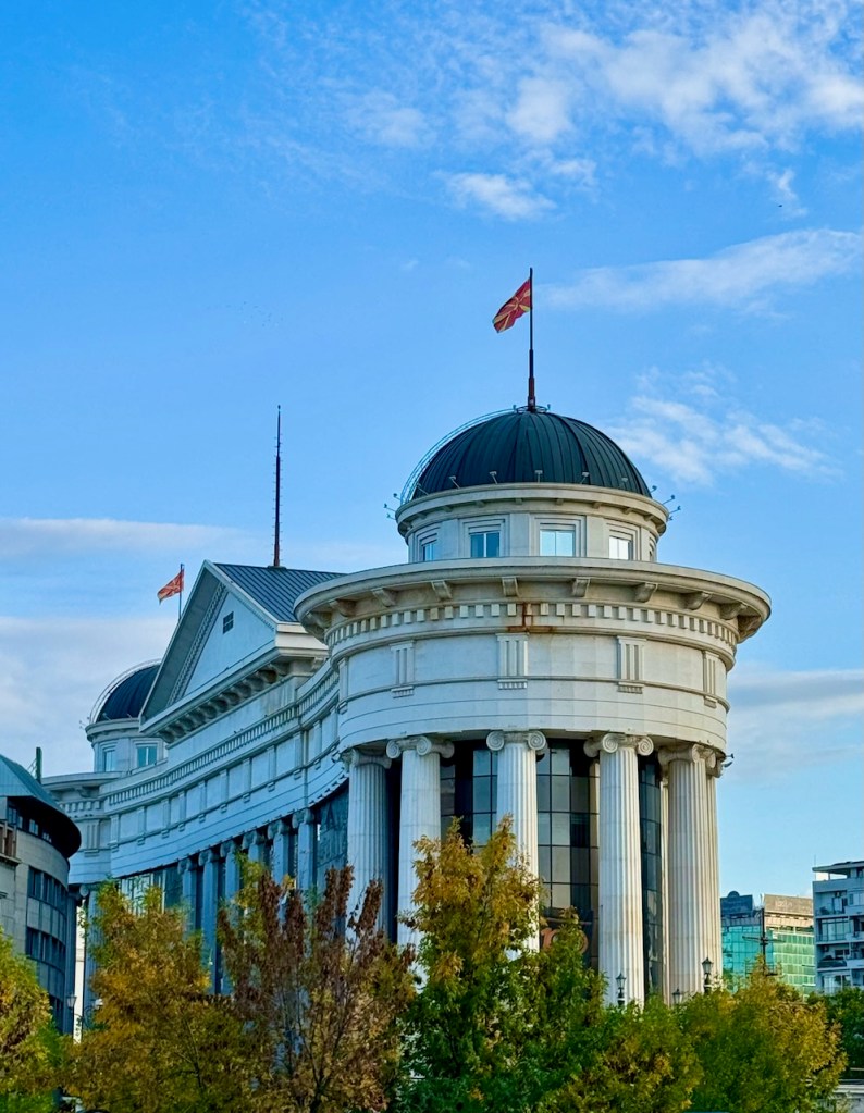 Vardar-joen varrella on myös Pohjois-Makedonian hallituksen virasto. Lippurivi on komea.