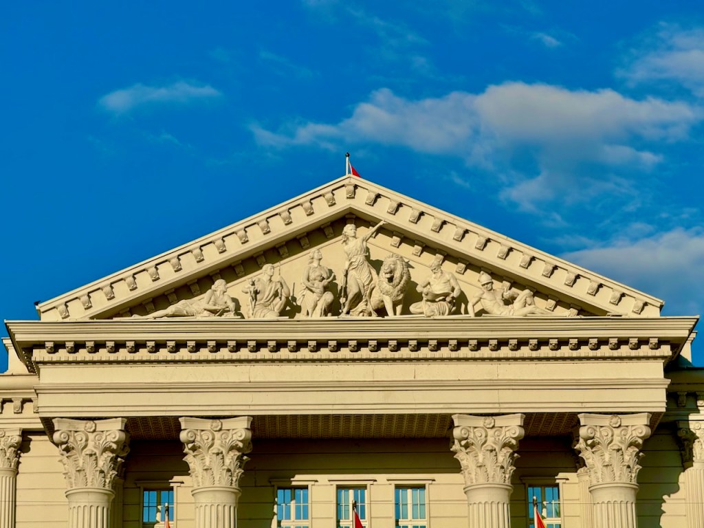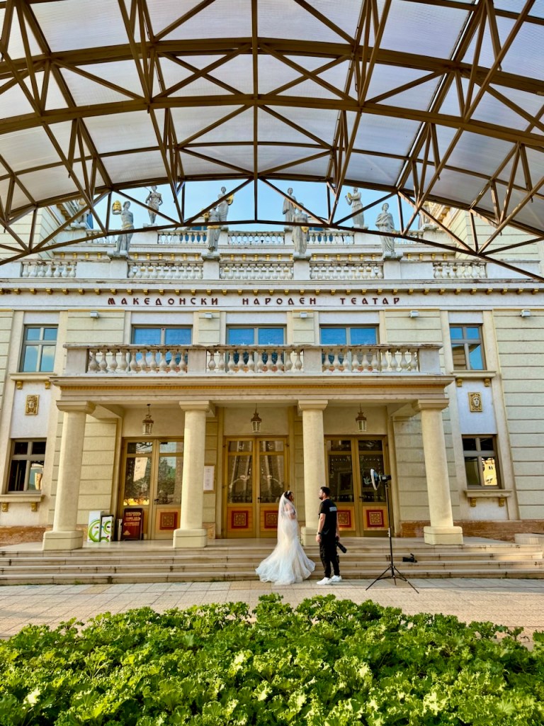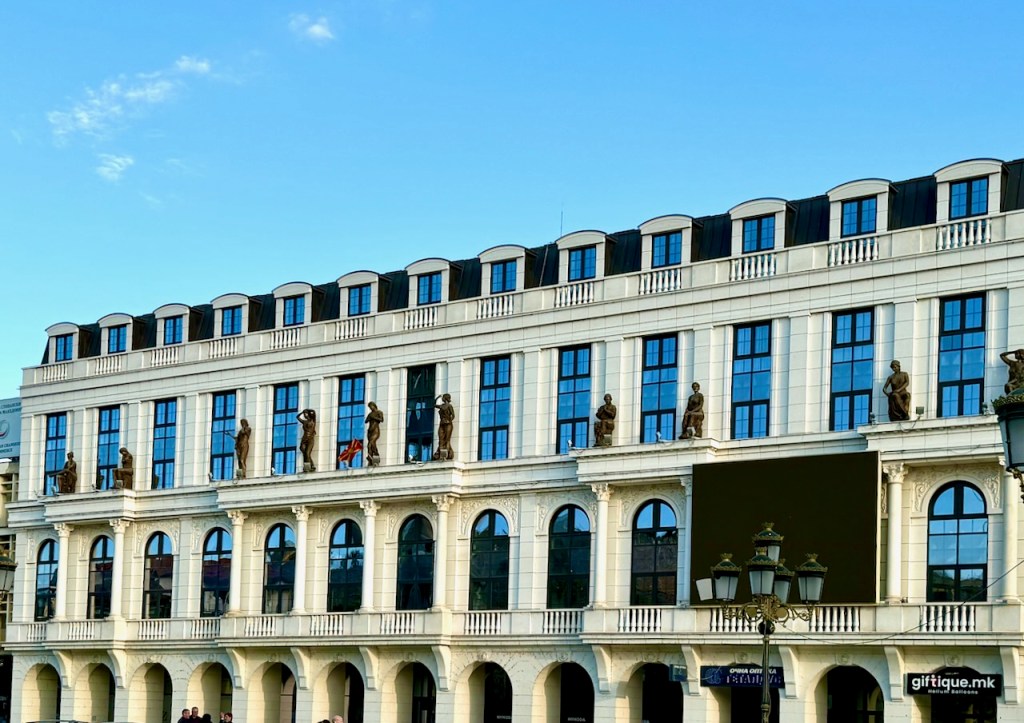 Basaarista alas tullessa on kohta Makedonian aukiolla ja sen lähellä olevien rakennusten luona. Yksi näistä on Teatterirakennus, jonka ympäristössä on myös valtava määrä patsaita.